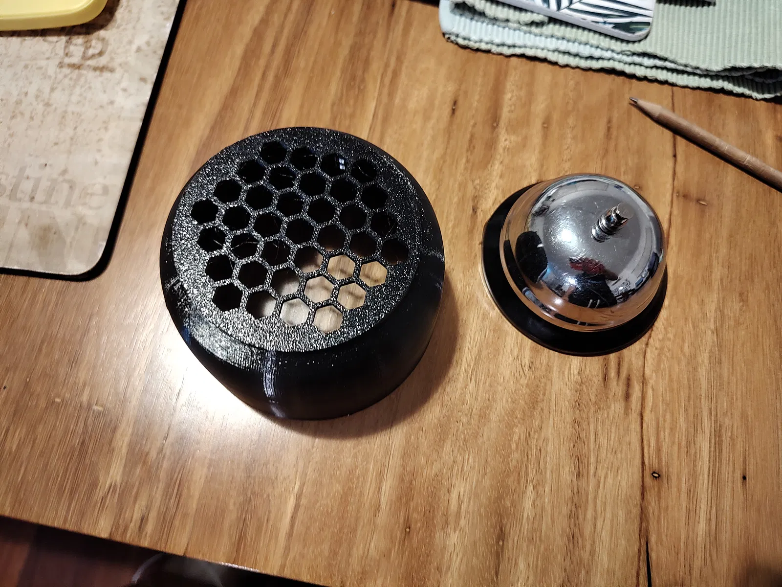 Mẫu cốc/nắp che cho trò chơi qua lại, nơi người chơi cố khiến đối phương đụng trúng chuông để chịu phạt. In bằng PETG, dùng họa tiết lỗ Hex để vẫn nhìn thấy chuông bên trong.