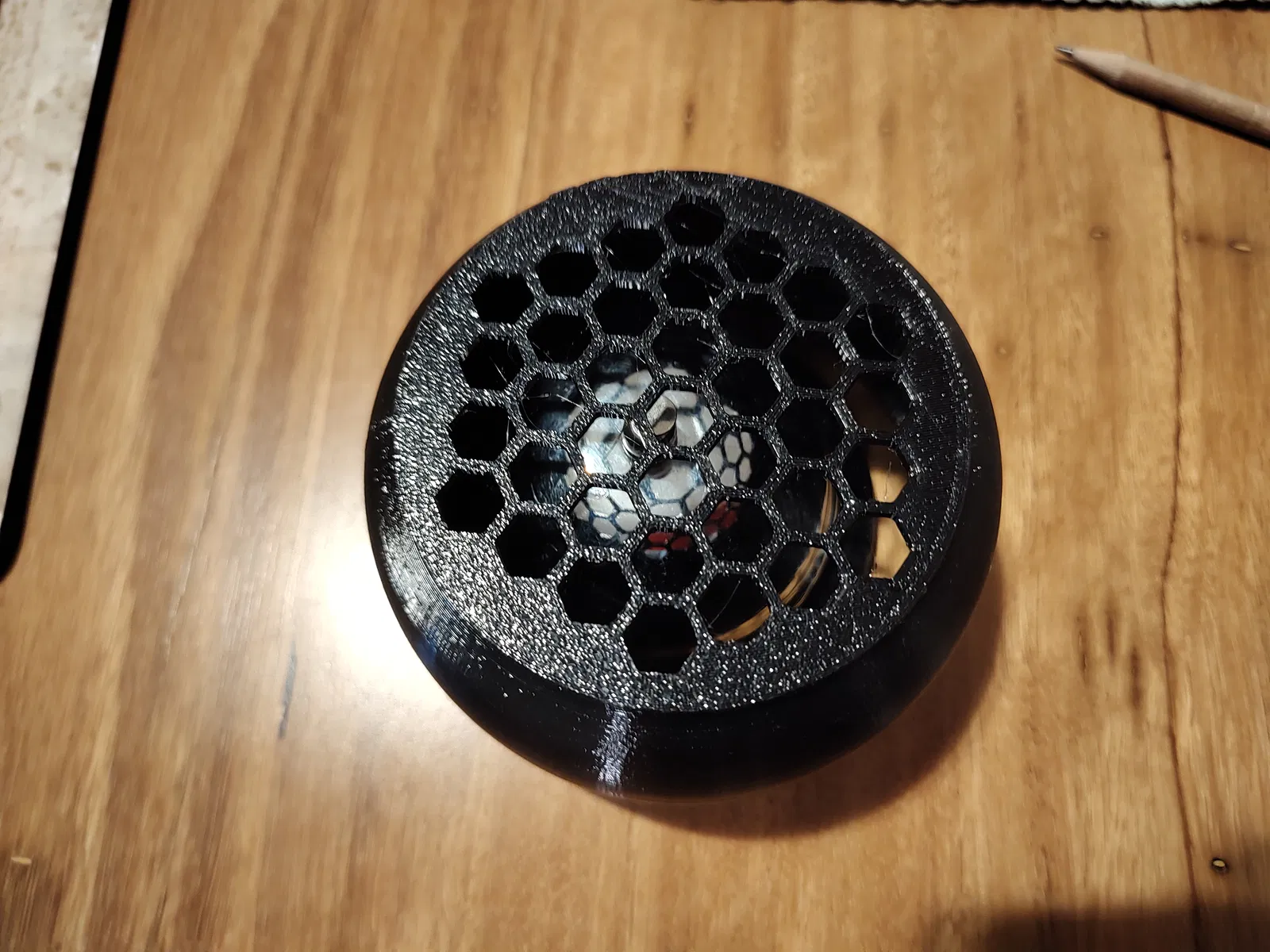 In bằng PETG. Mình dùng họa tiết lỗ Hex để bạn vẫn nhìn thấy cái chuông (thường mấy cái này là hộp nhựa trong suốt, nhưng lúc đó mình không có sẵn).
