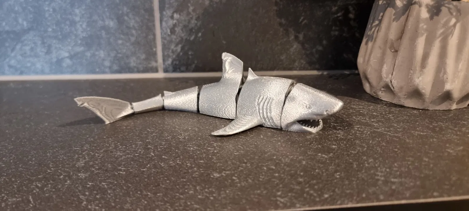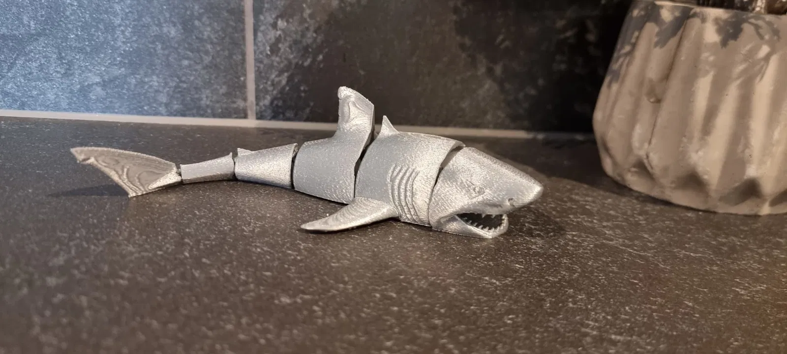 Thân khớp (Articulated Body): Mô hình cá mập được chia thành nhiều đoạn khớp lồng vào nhau (khoảng năm hoặc sáu phần). Nhờ vậy khi cầm trên tay, mô hình có thể “bơi” với chuyển động mềm mại, tự nhiên. Tác giả còn thêm nhiều chi tiết rất đã mắt như khe mang được khắc rõ, một hàng răng nhọn trông khá dữ, và phần hàm hơi hé mở làm mô hình có hồn hơn.