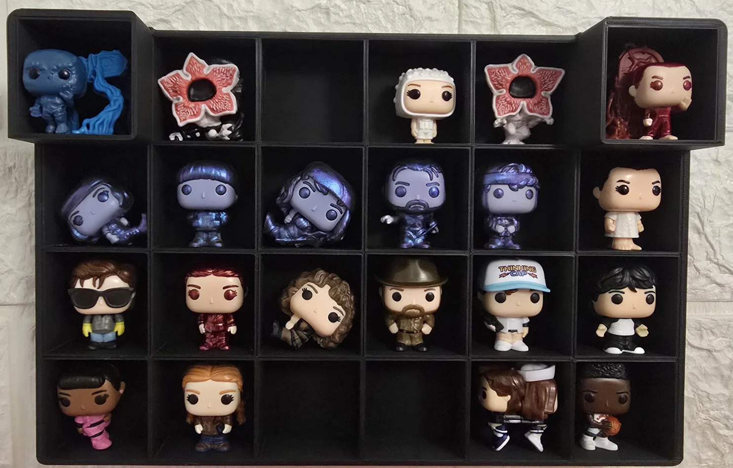 Mẫu giá treo tường (wall stand) dành cho Kinder Joy Stranger Things. Tác giả cũng dự định bổ sung thêm các mini stand cho một số figure để đứng vững hơn, tránh bị ngã khi trưng bày.