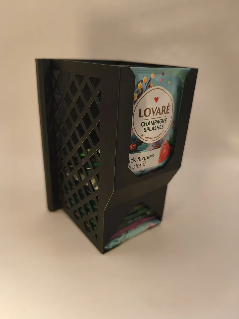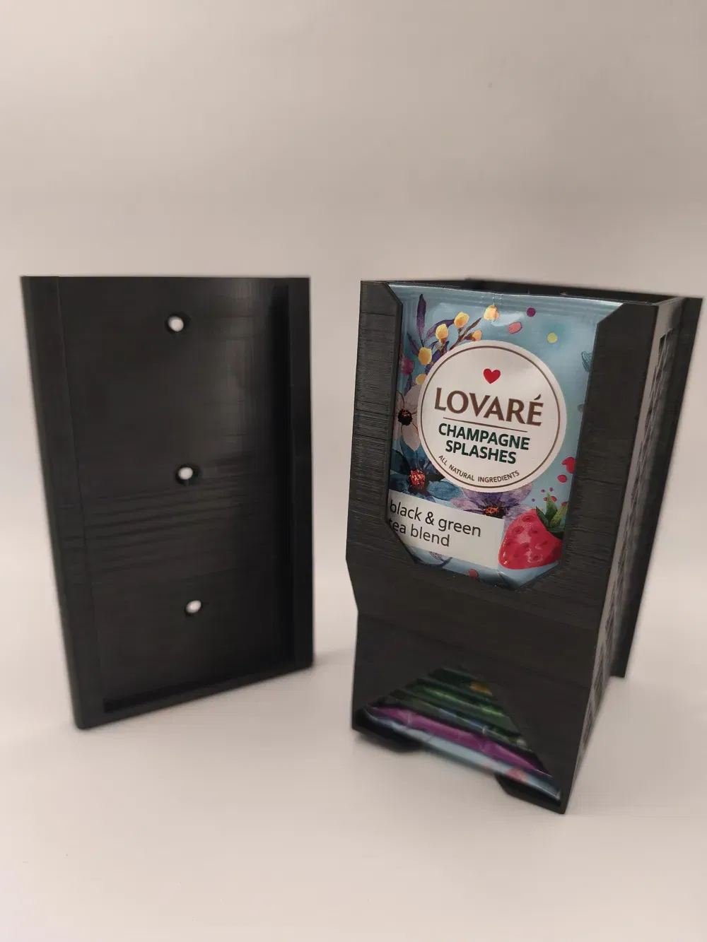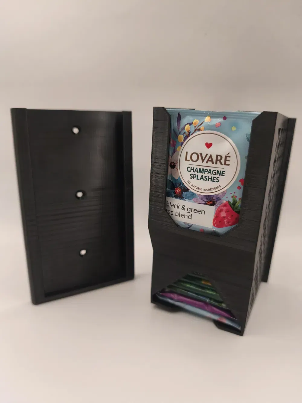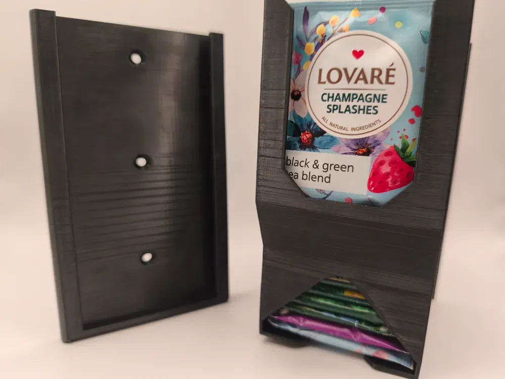 Mẫu Wall Mount Tea Dispenser giúp sắp xếp hộp trà gọn gàng trên tường. In PETG đen, supports Organic Tree, infill 15%, 2 walls. Tương thích nhiều hãng như Dilmah, Loyd; lắp bằng 3 vít countersunk 3.5mm.