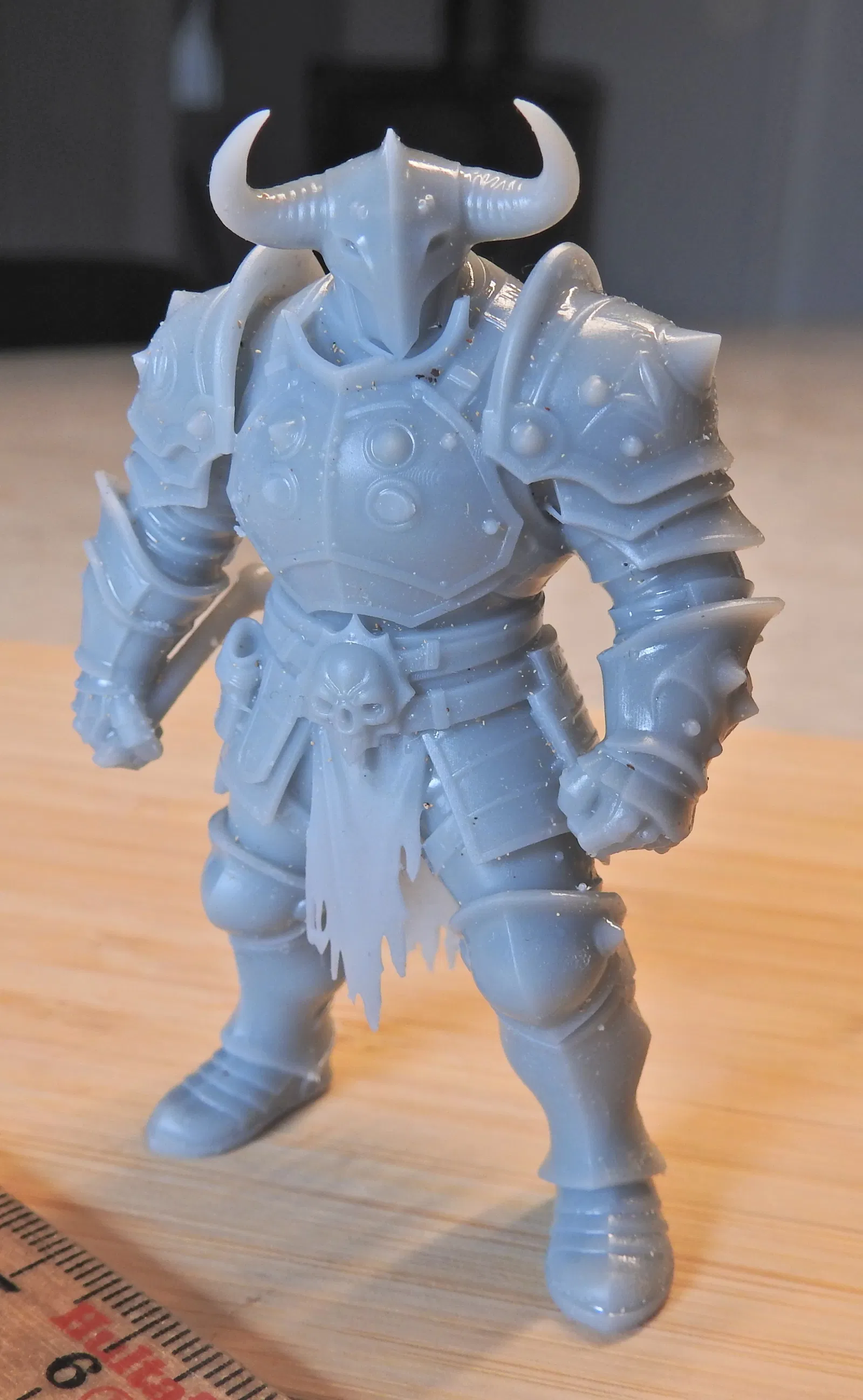 Hiệp sĩ do AI tạo với mũ giáp có sừng. Mẫu hiệp sĩ này là bản AI chuyển thể từ một hình trên Pinterest. Mình đã in ở tỉ lệ 1:24 (78mm) trên máy Elegoo Saturn 3 với 3D Jake Tabletop Resin.