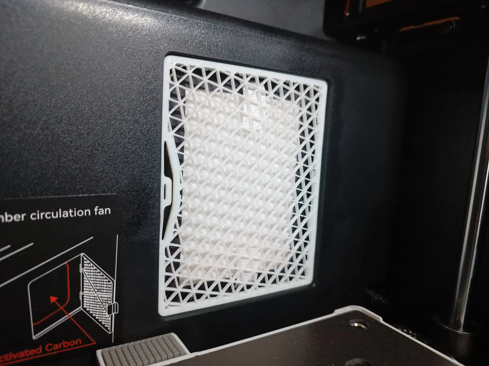 Động lực để thiết kế cánh cửa lọc buồng (chamber filter door) dạng phẳng là do lỗi lặp đi lặp lại khi bàn in (build plate) chạm vào tay nắm của cửa lọc.