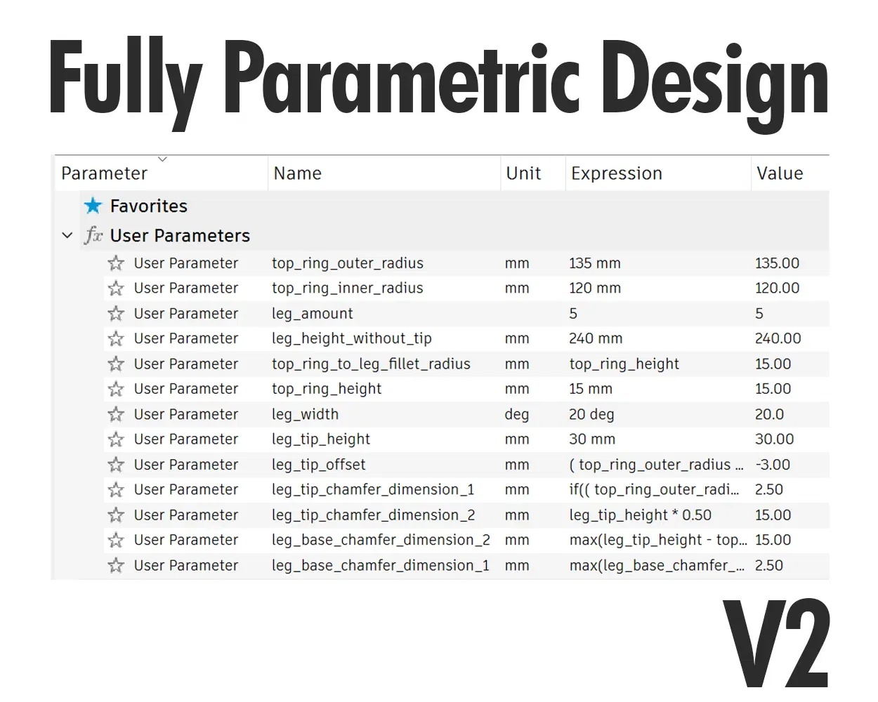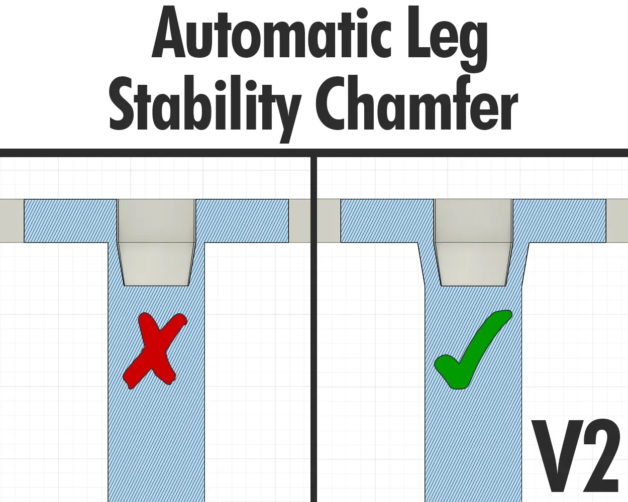 - 08.09.2023 (V2.1): - Đã phát hành V2.1 - Di chuyển các tham số người dùng được sử dụng nhiều nhất vào mục yêu thích - Giảm số lượng chân tối thiểu xuống còn 1 - Sửa lỗi caveat của lỗ chồng khi sử dụng ≤ 2 chân - Giảm cạnh vát 2mm theo mặc định để ngăn ngừa đầu chân sắc (leg_tip_chamfer_peak_reduction).