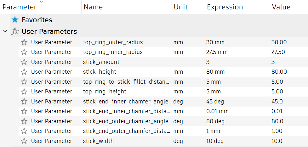 - Các cạnh vát chân/que tùy chỉnh ở đáy Caveats: - Mỗi chân/thanh sẽ là một đối tượng/phần riêng biệt vì Fusion 360 tại thời điểm viết không hỗ trợ kết hợp tất cả các hình khối được tạo ra bởi một mẫu hình tròn trong thiết kế tham số. Để dễ dàng xử lý trong slicer, tốt nhất là xuất toàn bộ dự án dưới dạng tệp STL. Nếu nó được xuất dưới dạng tệp 3MF, tôi đề nghị tạo một lắp ráp của tất cả các phần ngay sau khi nhập vào slicer.