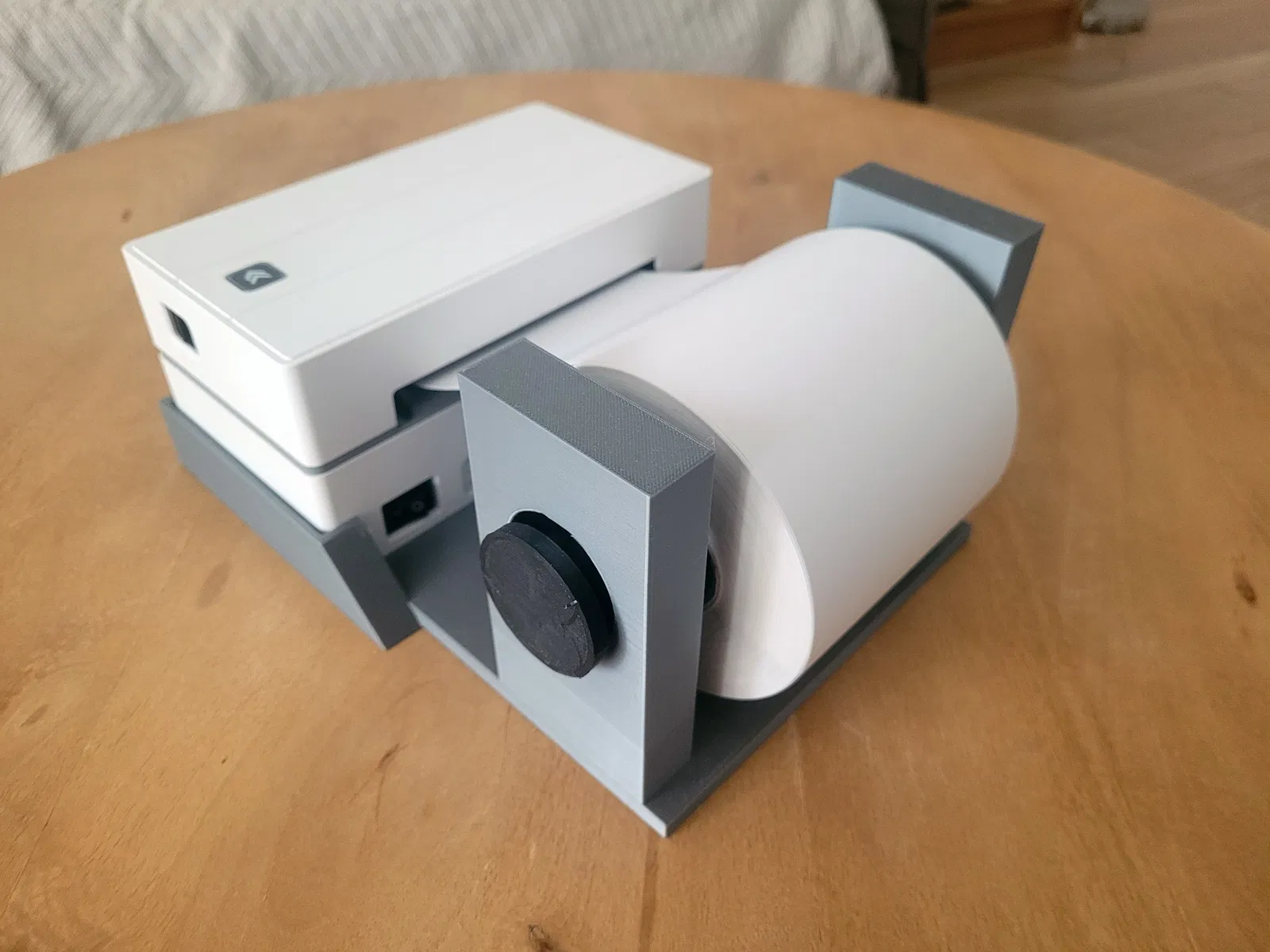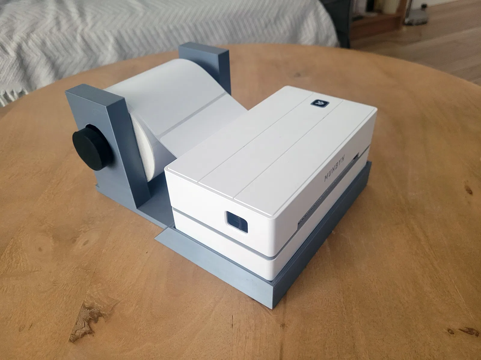 Docking station all-in-one cho MUNBYN ITPP130B, tích hợp sẵn giá đỡ cuộn tem và đế giữ đúng footprint zin. Thiết kế tối giản, chắc chắn, in FDM 100% support-free; có trục khóa vít để thay cuộn tem dễ dàng.