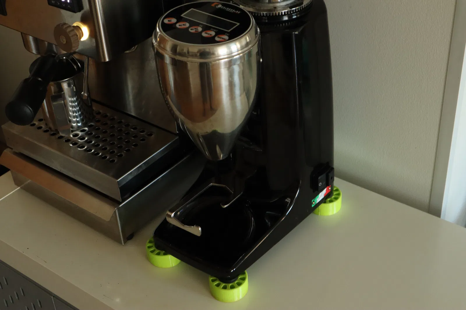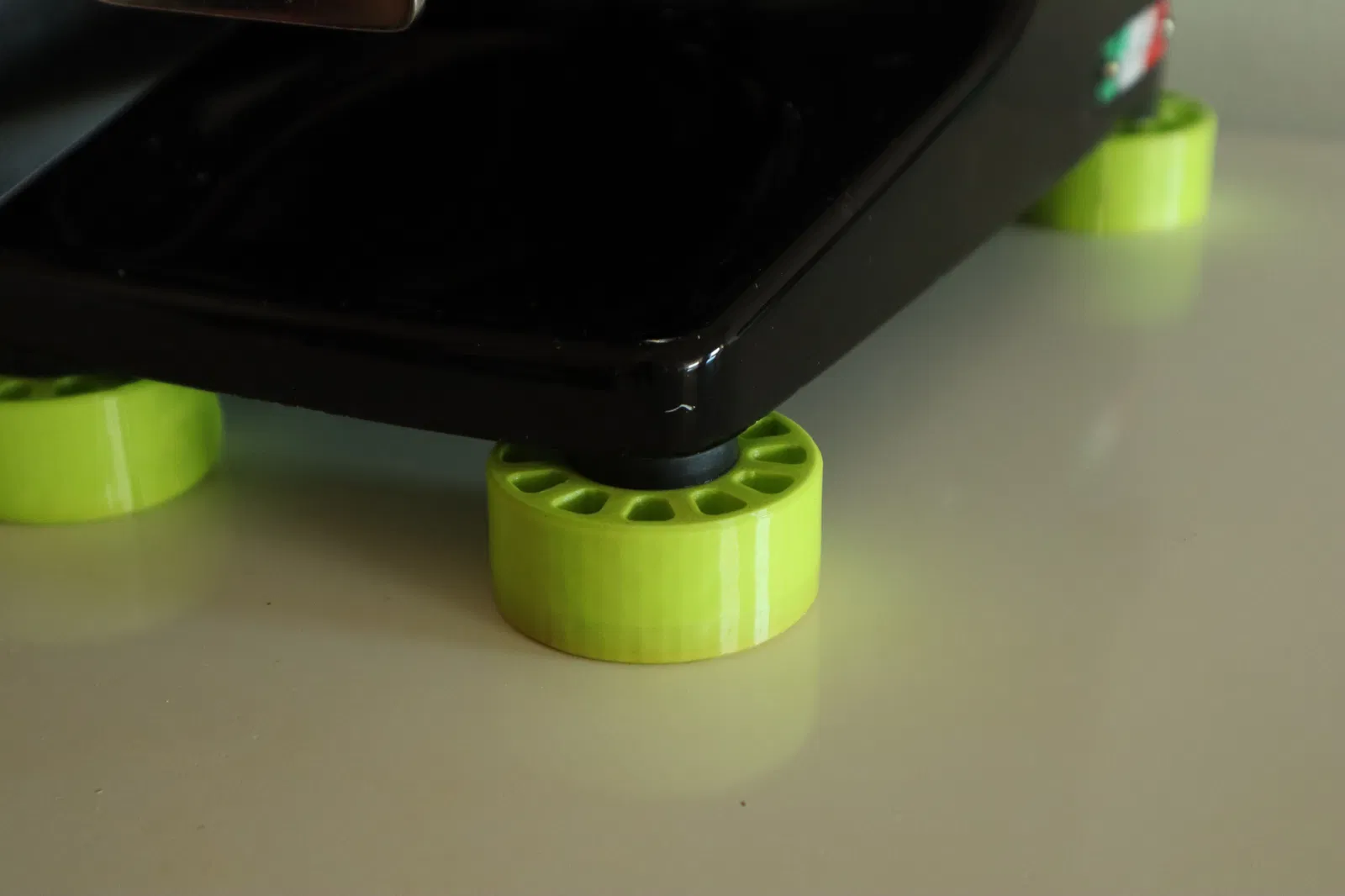 Bộ chân chống rung (anti-vibration feet) dành cho máy xay Quamar M80E, giúp giảm tiếng ồn khi đặt trên bàn rỗng/hút âm kém. Khuyến nghị in bằng TPU; 95A phù hợp hơn nếu máy nặng, màu tối nhìn gọn sạch.