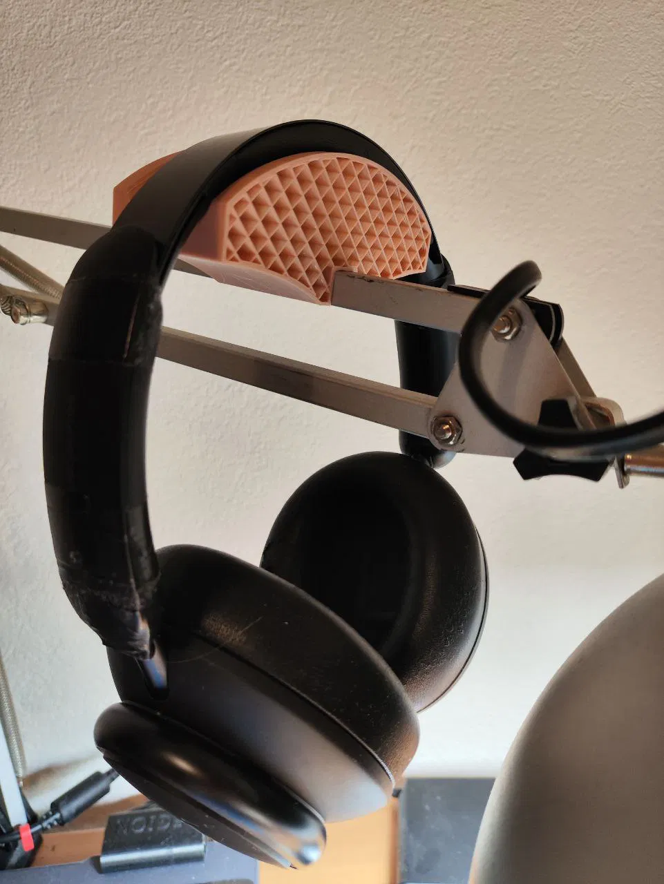 Giá treo tai nghe gắn cho đèn IKEA, in bằng PETG. Thiết lập in: 0 lớp top/bottom và 15% infill, phù hợp để treo headphones gọn gàng ngay trên lamp.