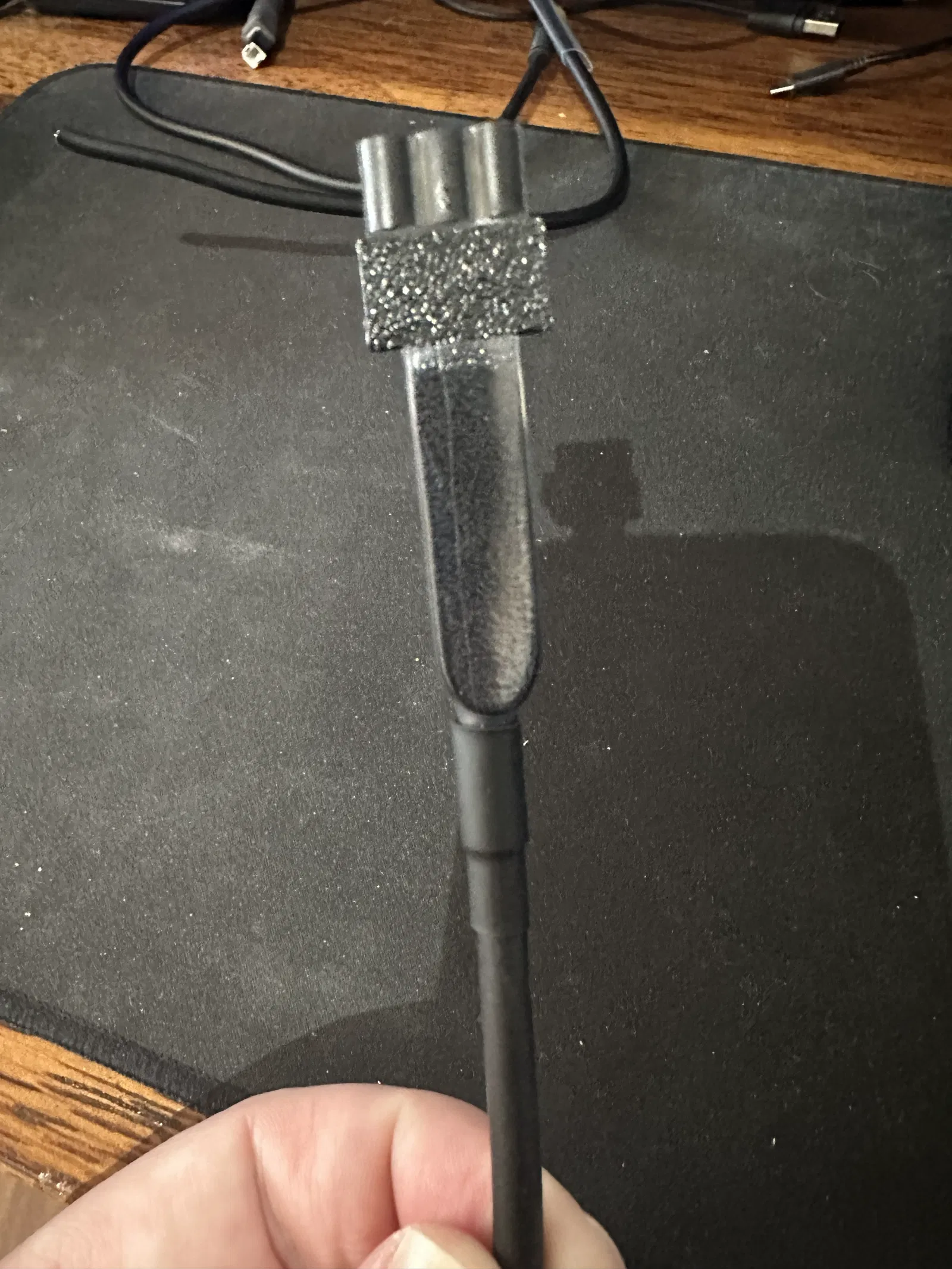 Cách lắp đặt: Cái strain relief nguyên bản nhìn như là một phần của thân connector, nhưng thật ra nó được dán ở mặt dưới. Có thể dùng một cái nạo mỏng (thin scraper) nhẹ nhàng cạy và bóc ra, để lại một bề mặt phẳng sạch cho món thay thế. Mình chấm một cục nhỏ CA/superglue lên phần đáy của strain relief mới rồi đặt connector lên trên.