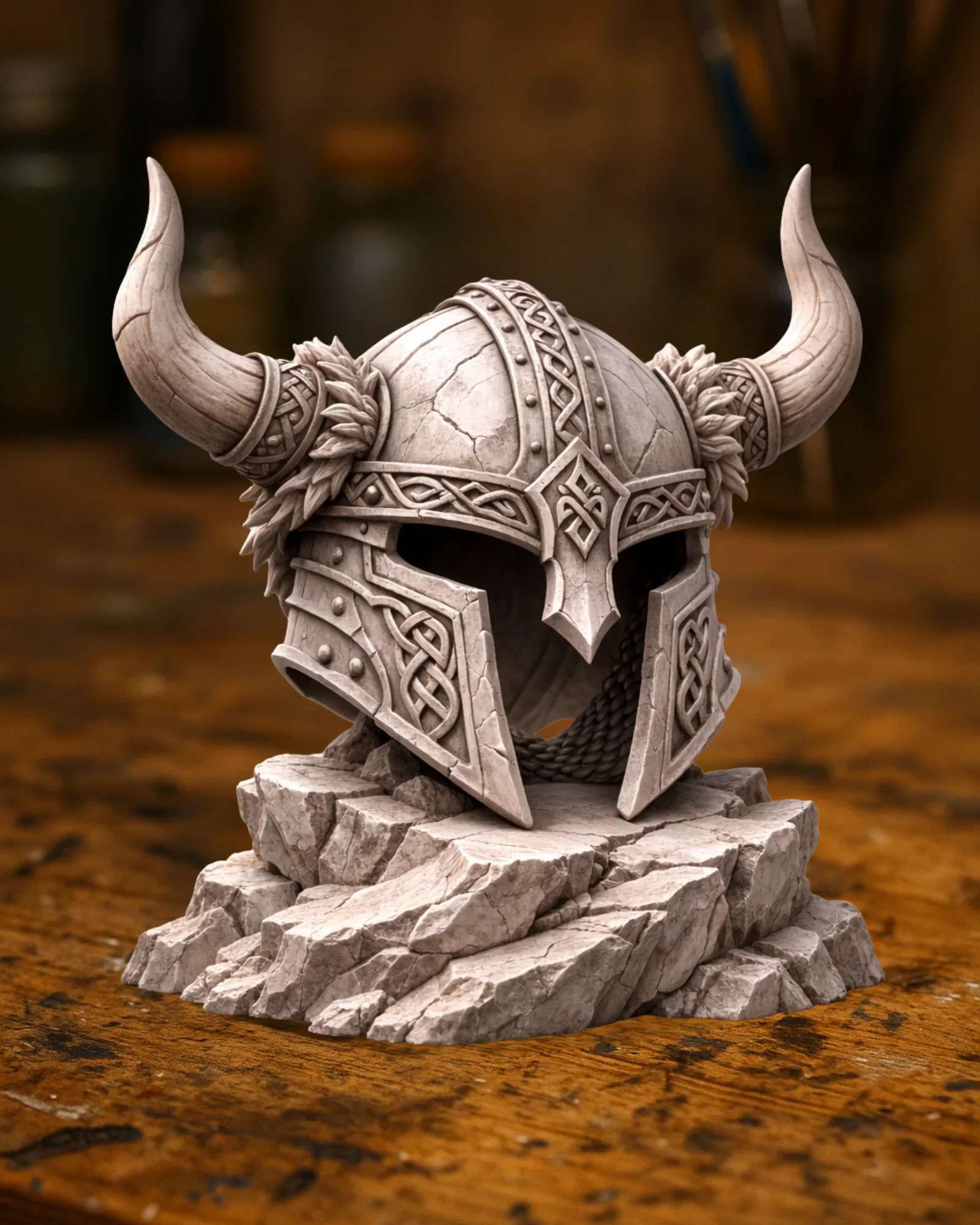 Mẫu mũ Viking có sừng với hoa văn Nordic tinh xảo và hiệu ứng bề mặt đá nứt chân thực. Phần mũ được gắn trên bệ đá gồ ghề, rất hợp để trưng bày decor hoặc làm tượng sưu tầm.