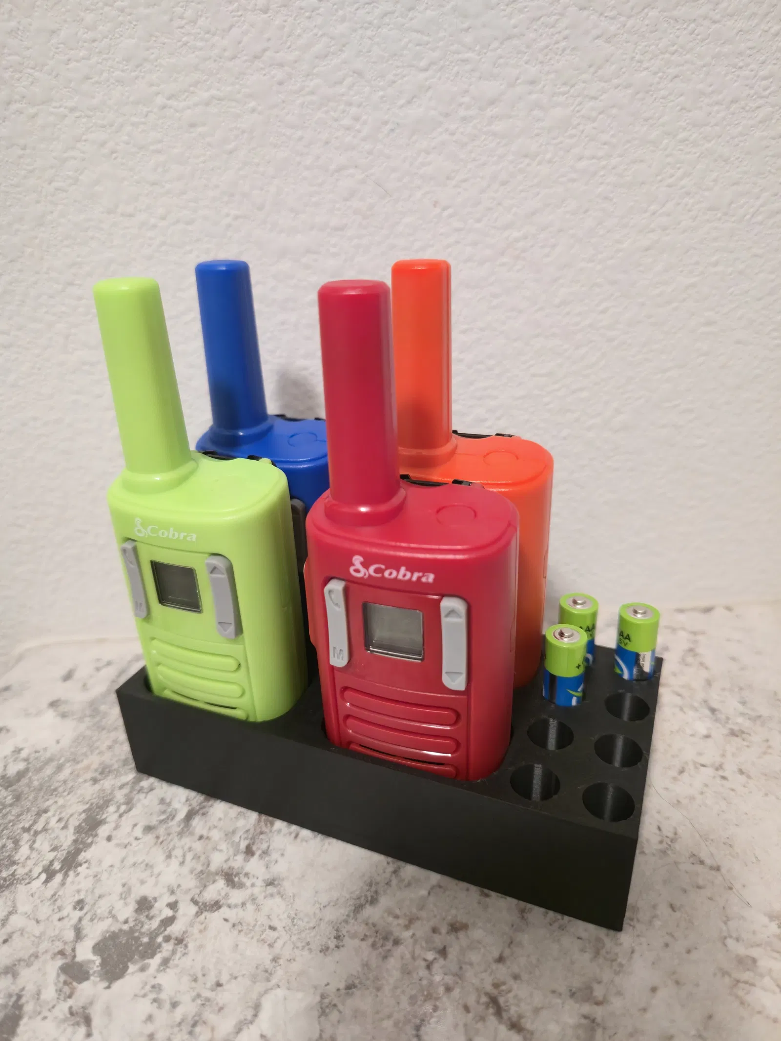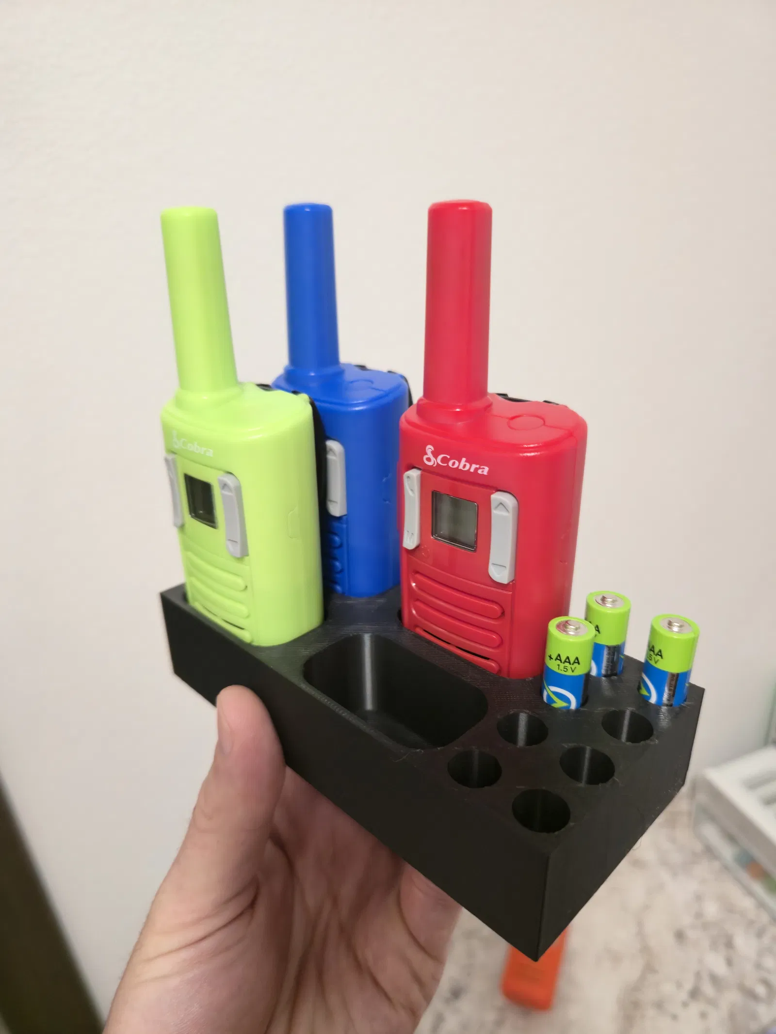 Nếu bạn có bộ Cobra RX-100 4-pack thì đây là một giải pháp gọn gàng để sắp xếp bộ đàm, lúc nào cũng sẵn cầm lên dùng. Mình có kèm file STEP nếu bạn muốn chỉnh sửa, ví dụ thêm chỗ để nhiều bộ đàm hoặc thêm pin (nếu bạn có máy in lớn hơn).