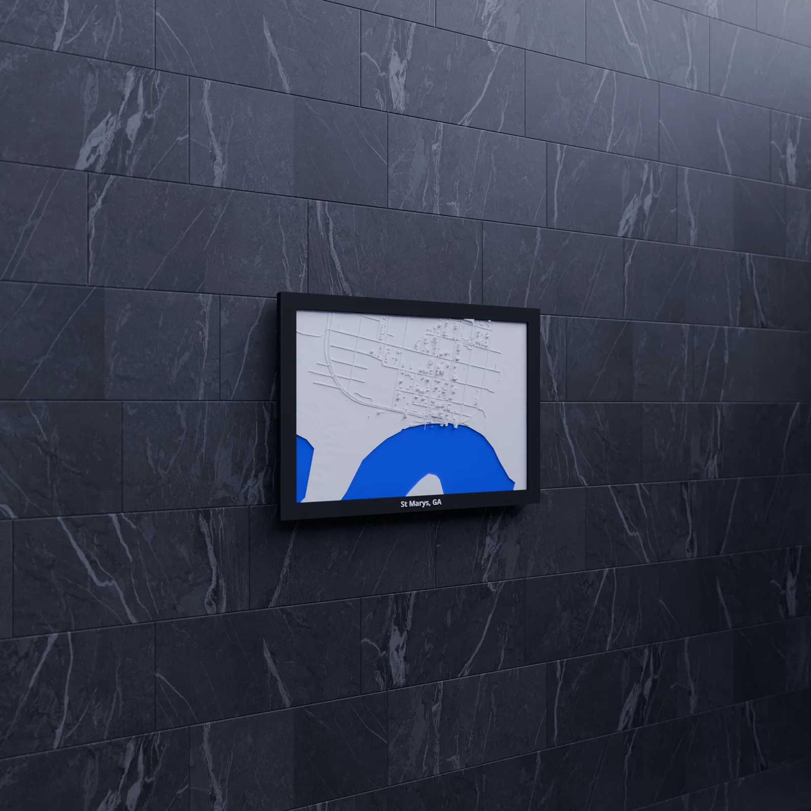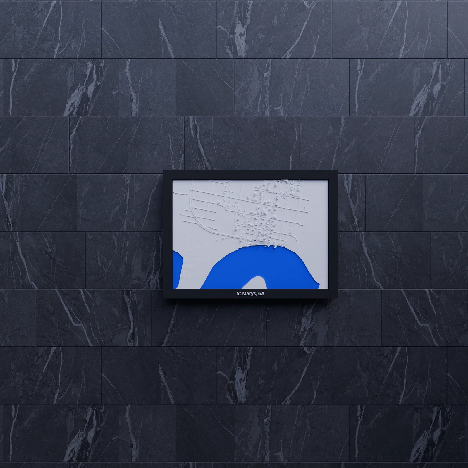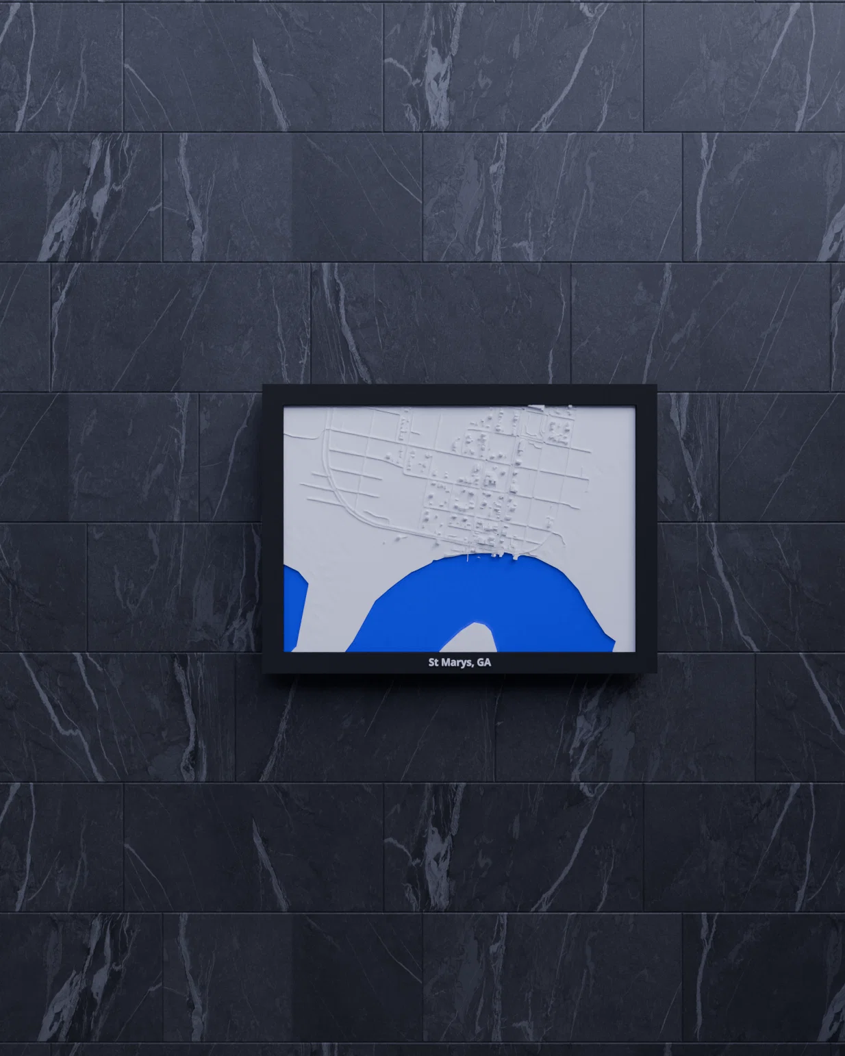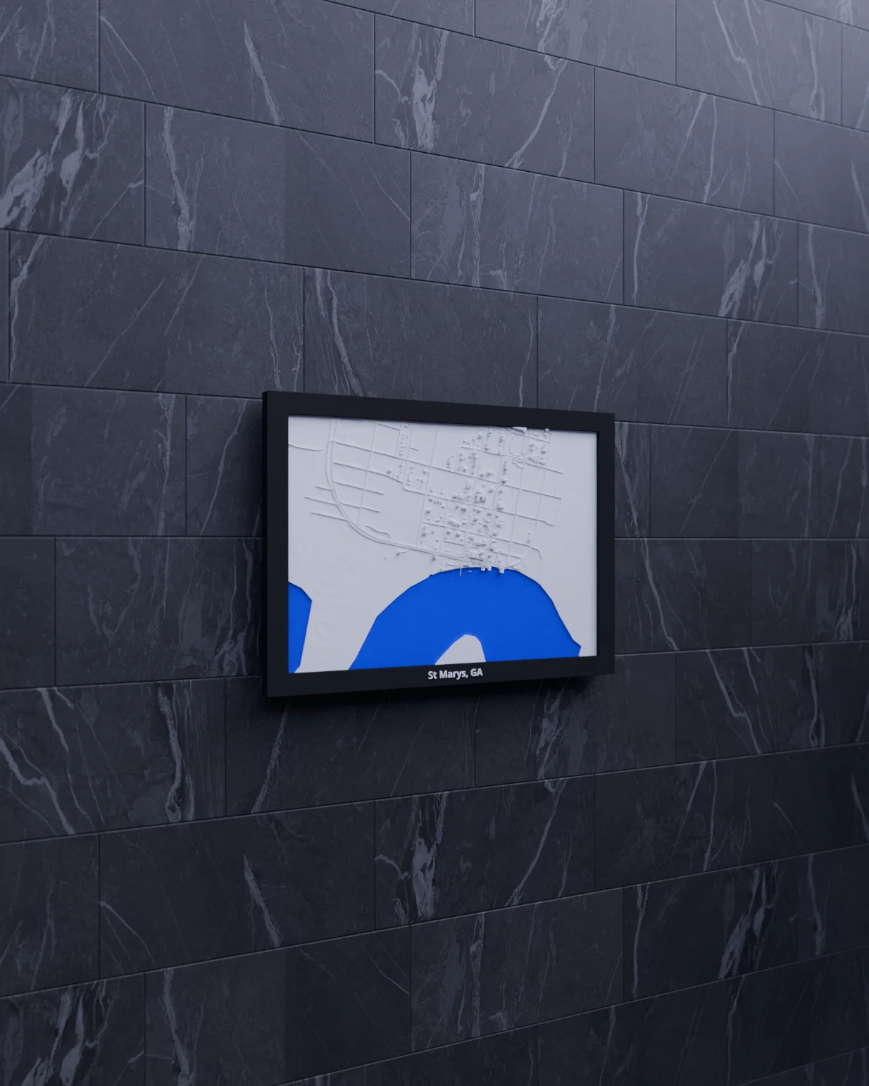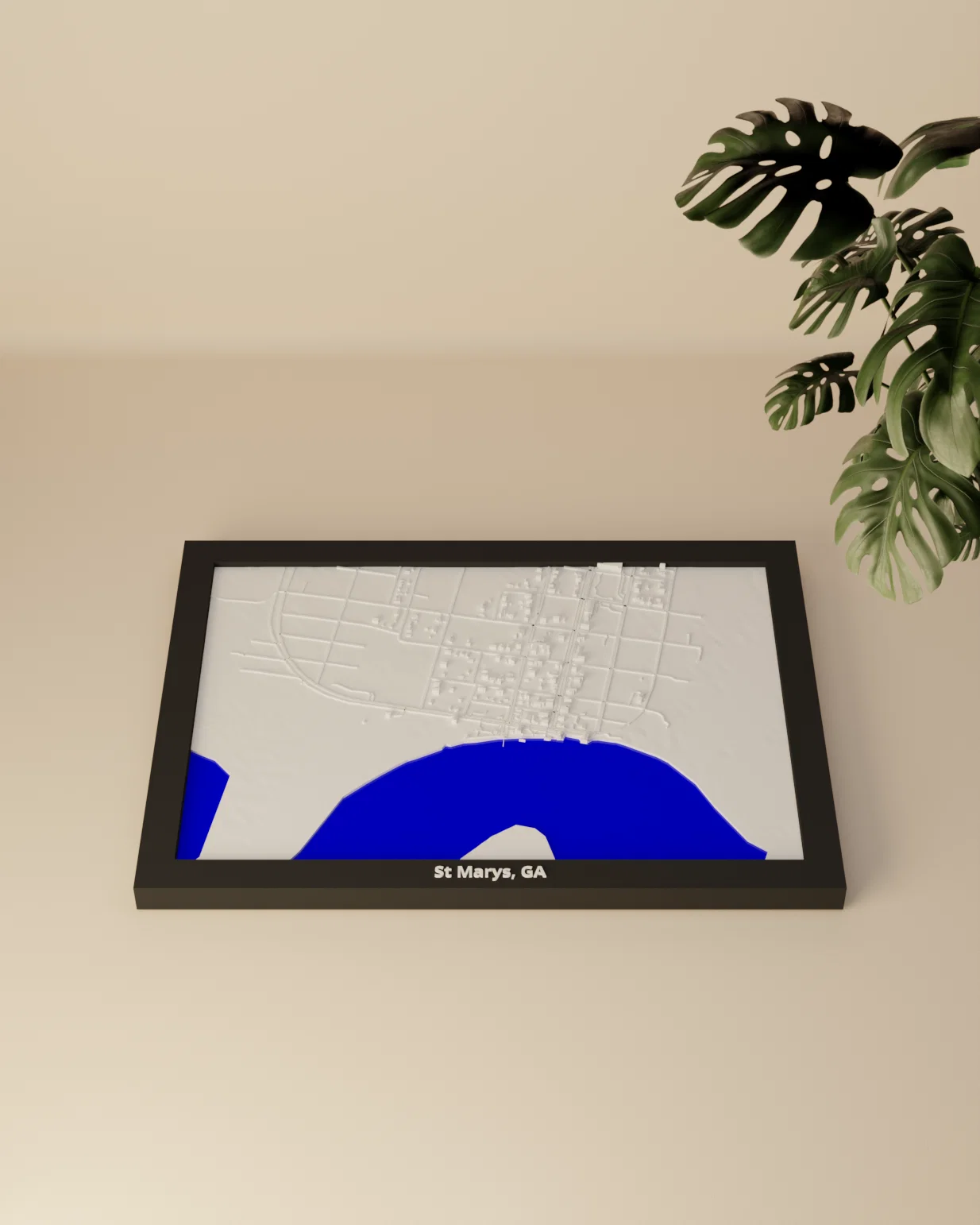Tái hiện vẻ đẹp cảnh quan thành phố St Marys, GA với mô hình địa hình thu nhỏ này! Mẫu 3D này đại diện cho khu vực địa lý quanh tọa độ 30.721, -81.551 (LatLng).