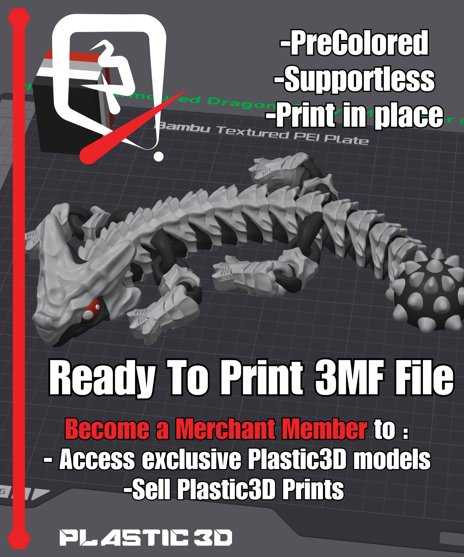 Mẫu Articulated Armored Dragon -BABY— The Fortified Scaled Sentinel với vảy giáp dày, thân khớp uốn lượn mượt. Print-in-place, supportless, không cần lắp ráp; hợp in nhiều màu/metallic. Có 3MF pre-colored.
