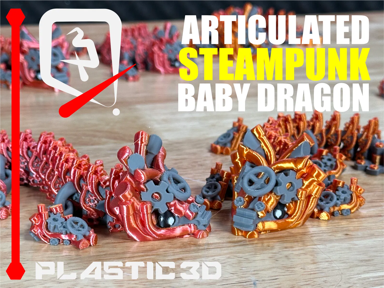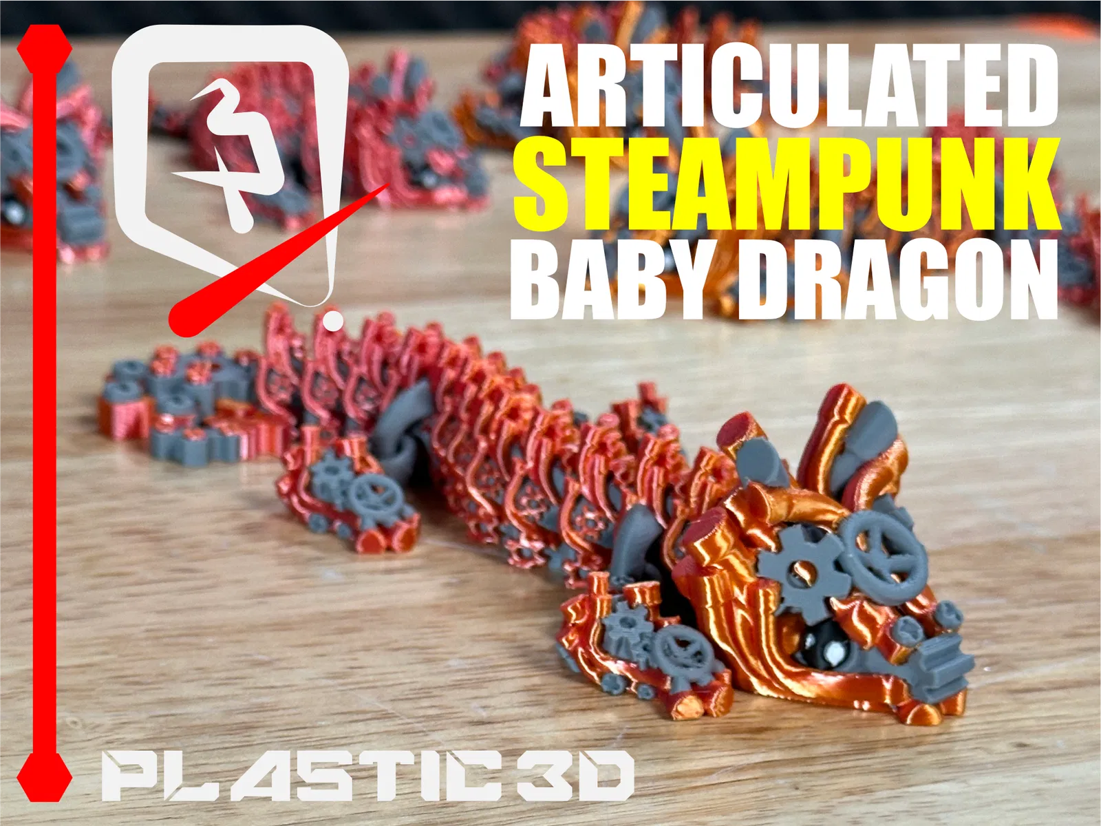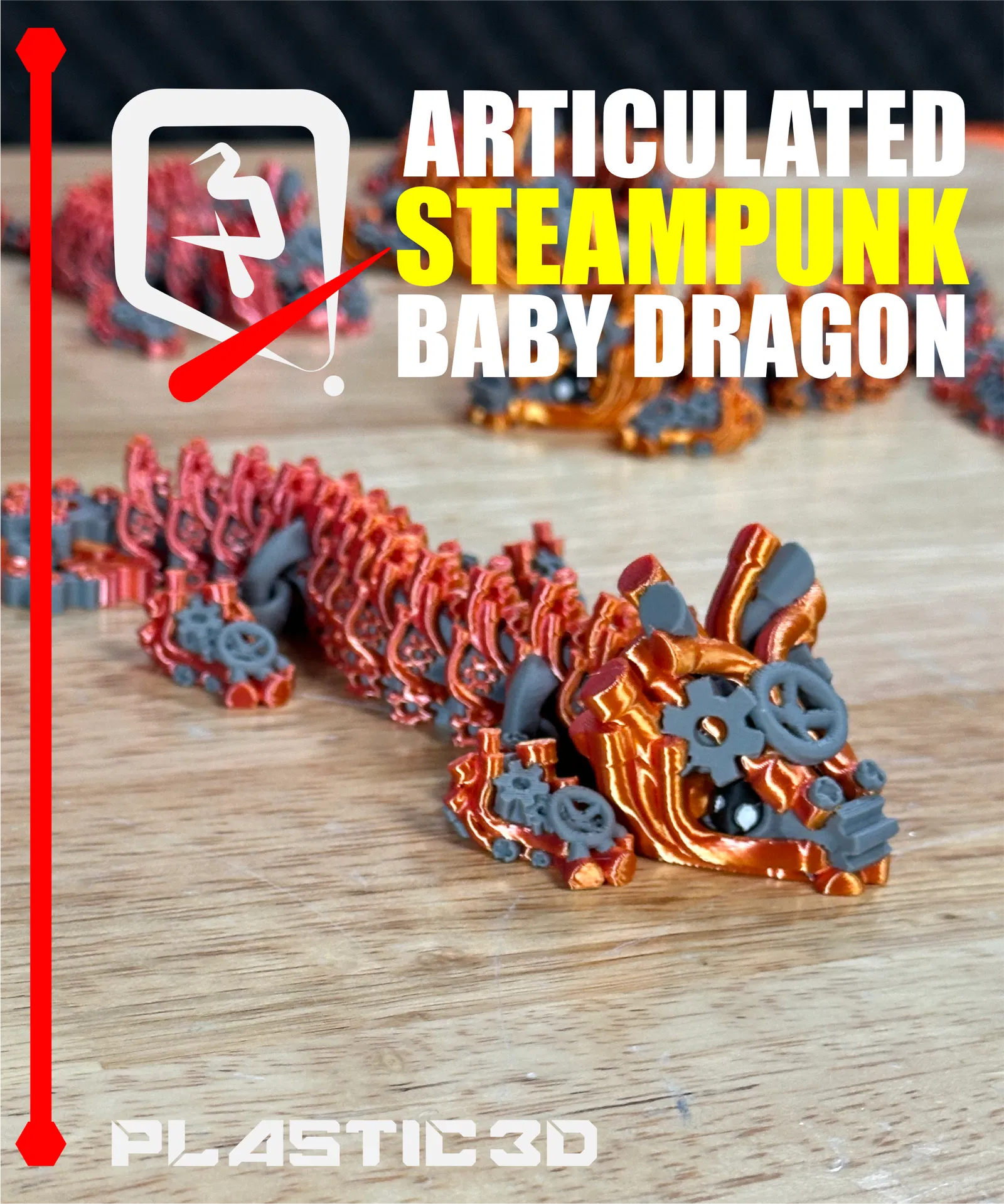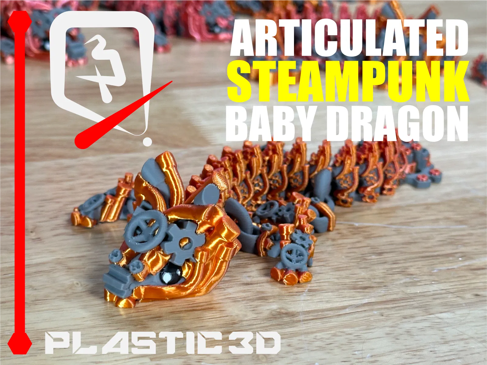 Mẫu Rồng Con Steampunk articulated dạng print-in-place, không cần support, chuyển động mượt với cấu trúc gear-mesh liền mạch che khớp. Tối ưu cho filament silk/dual-color và có file 3MF pre-colored.