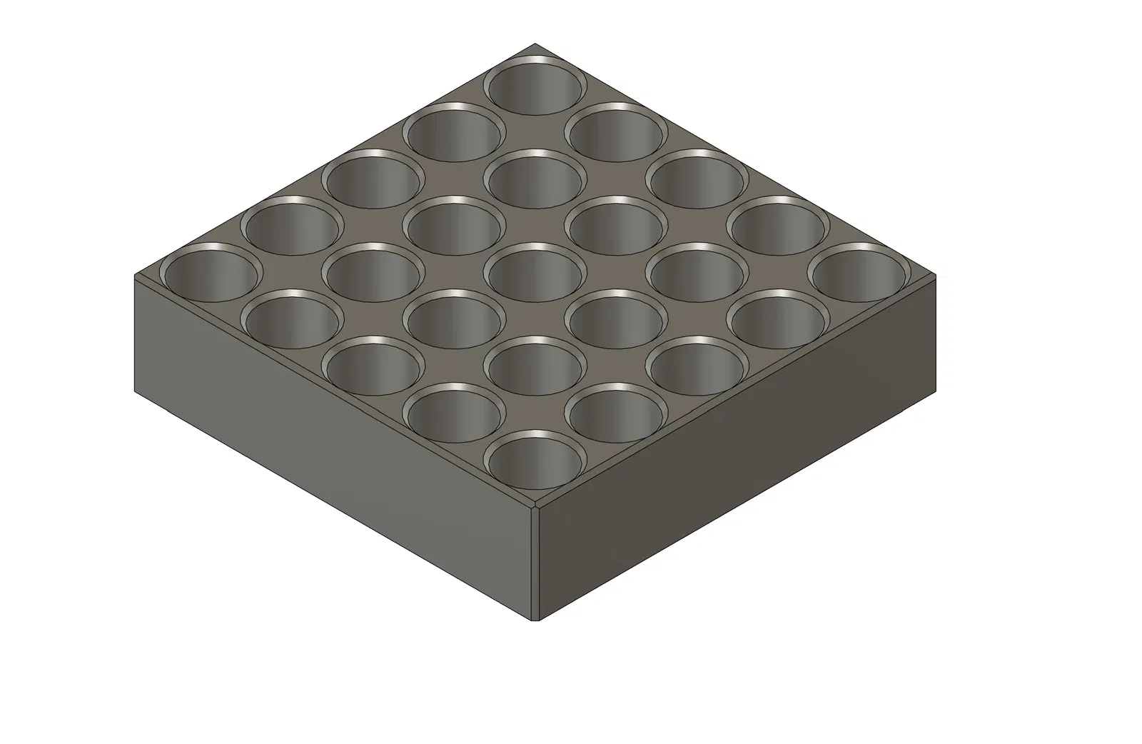 Khay giữ collet 5C dạng lưới 5x5, tổng cộng 25 vị trí. Kích thước 200x200mm, chiều cao 50mm, phù hợp để sắp xếp collet gọn gàng trên bàn làm việc hoặc trong xưởng.