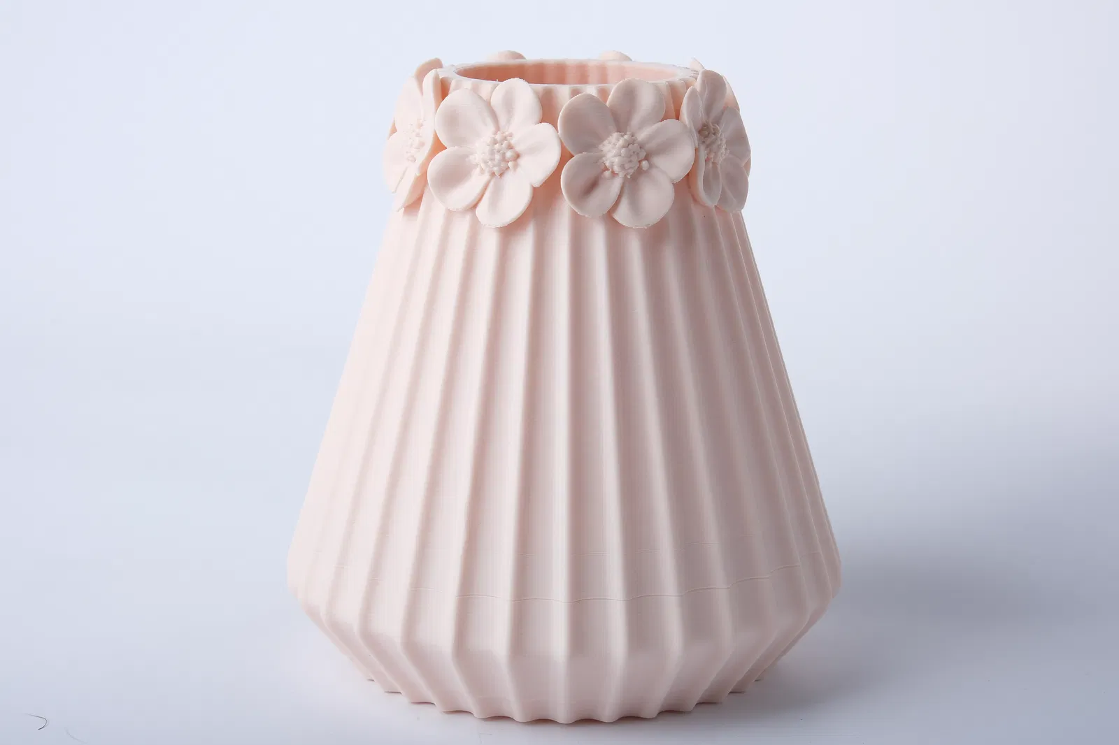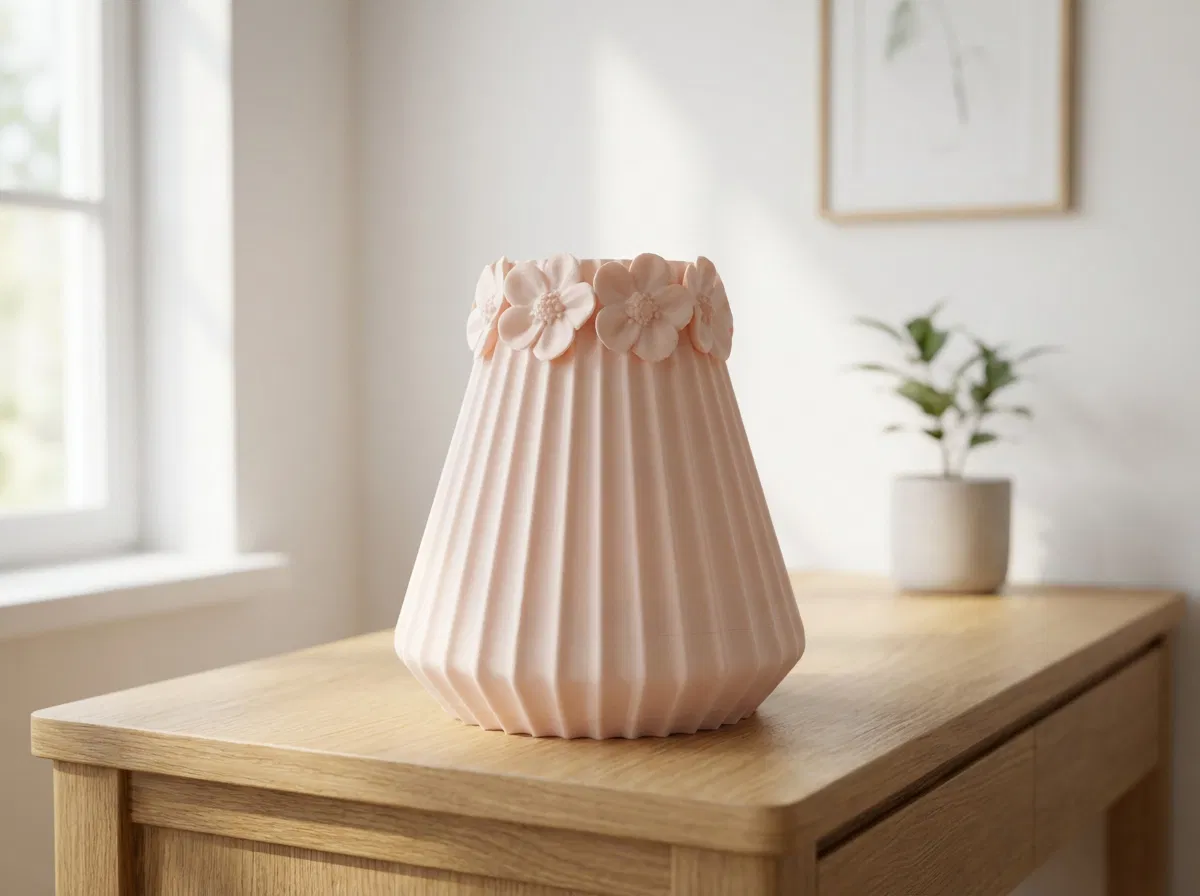 Chính sự tương phản đó làm nó đặc biệt: lãng mạn nhưng vẫn rất hiện đại và thiên về thiết kế—mềm mại, ấm áp, không hề bị ngọt quá. In bằng nhựa mờ theo phong cách 3D-print, ánh sáng rơi lên các đường gân rất đẹp, làm nổi khối hình học với độ glow mượt và đều, trong khi cụm “hoa” ở vành miệng tạo cảm giác kiểu “khoan… cái này là gì vậy?” ngay lập tức.