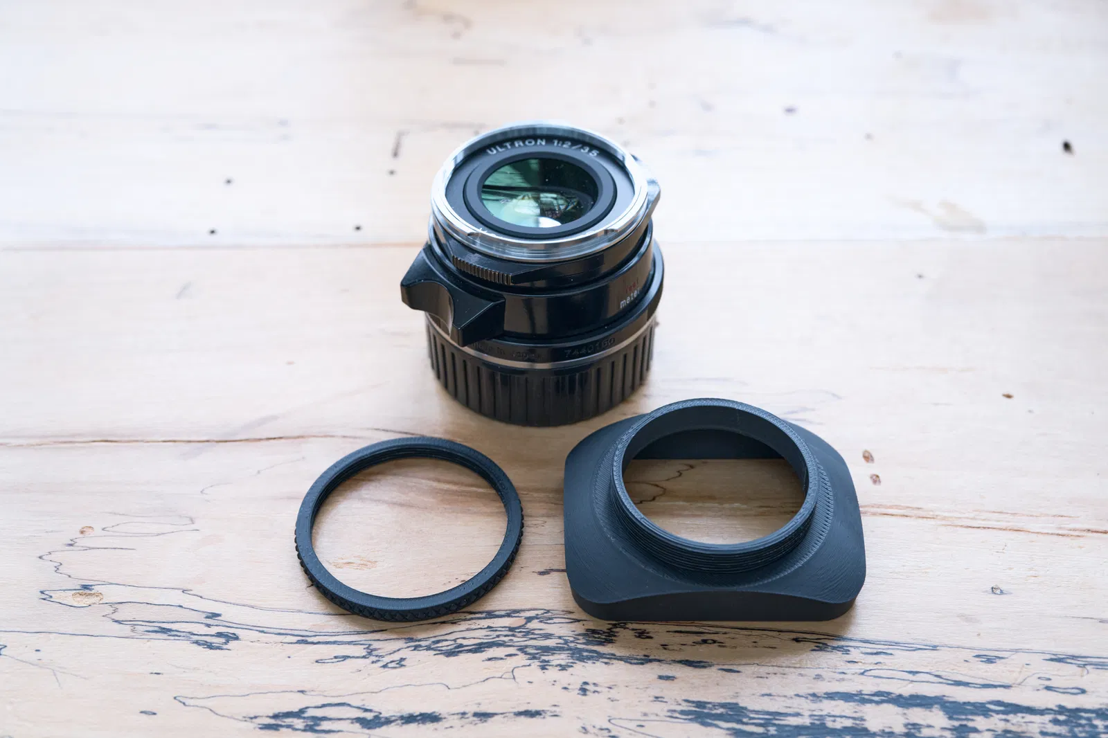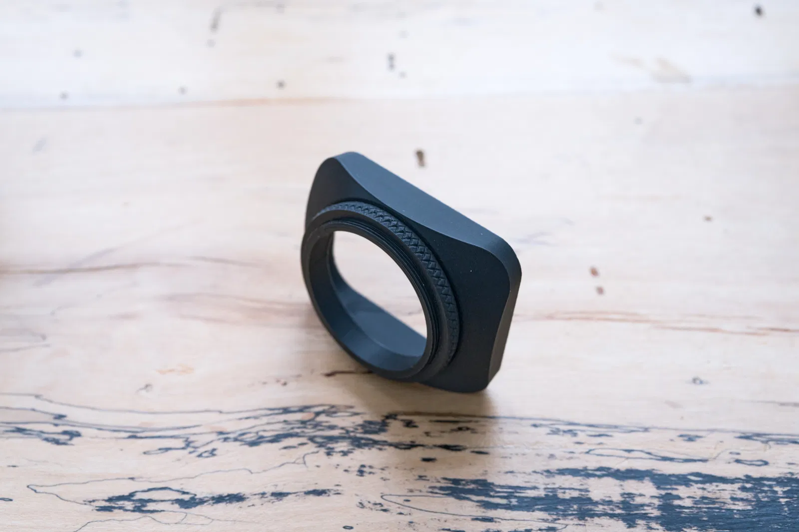 Lens hood dạng vuông vặn vào ren filter 39mm, tối ưu cho góc nhìn khoảng 35mm f/2. Có vòng khóa knurled để canh đúng hướng rồi siết cố định. Có thể in không cần support nếu đặt đúng chiều.