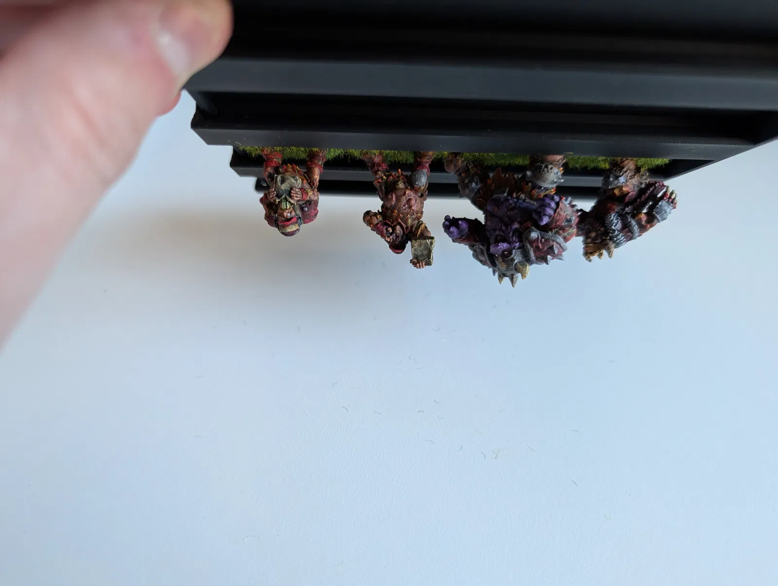 Trượt phần base của miniature vào khe. Khi xong, gắn cái chốt (pin) ở đầu hở để đảm bảo các model không bị trượt ra ngoài. Pin có cơ chế khóa đơn giản để tránh tự tuột ra. Thay vì dùng pin, bạn cũng có thể dùng dây thun quấn ngang bề rộng của khay. Có các miếng ngăn (dividers) tùy chọn có thể trượt vào trong các hàng, để tách từng model và tạo khoảng cách giữa model với bất cứ thứ gì ở phía trên. Trong mỗi hàng sẽ có chỗ để đặt divider giữa từng model.