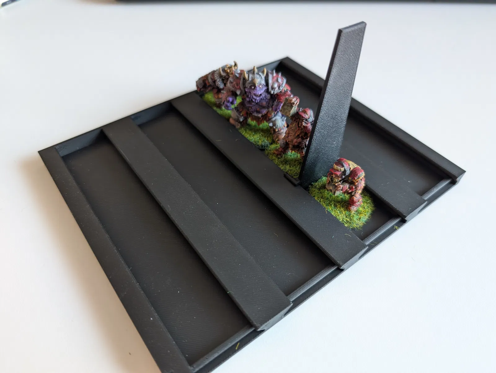Đây là một cái khay để mang theo một bộ miniatures đã gắn base, giúp hạn chế rủi ro làm rớt. Ban đầu nó được làm để xách nguyên một team Blood Bowl, nhưng bạn cũng có thể dùng cho các loại miniature khác.