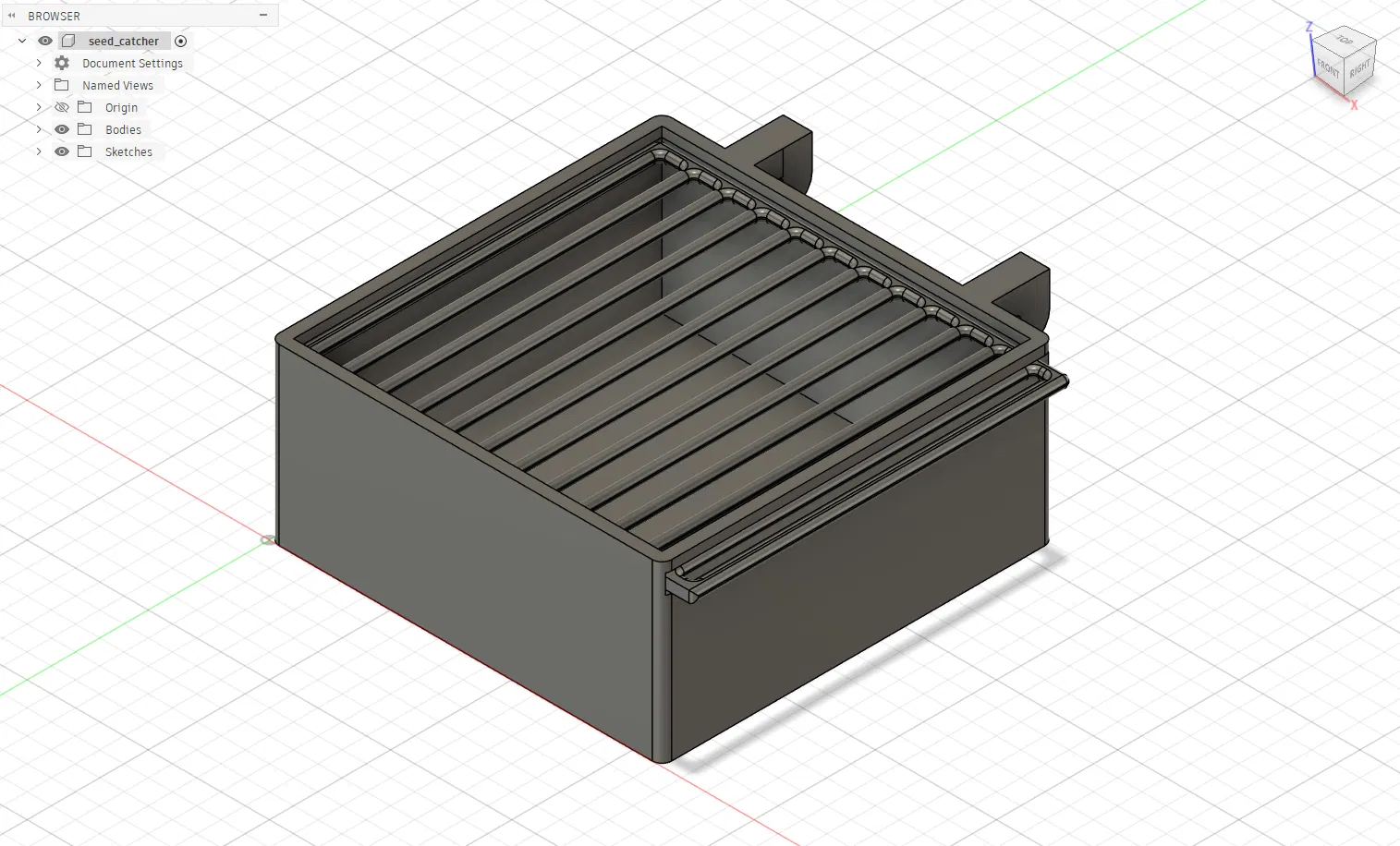 Thiết bị gắn vào các thanh lồng, đặt bên dưới vị trí gắn máng ăn để tránh chim làm đổ tràn thức ăn ra ngoài. Seed catcher này giúp ngăn con vật lợi dụng beaglebone bằng cách gom thức ăn, đồng thời tránh làm gián đoạn behavioral task.