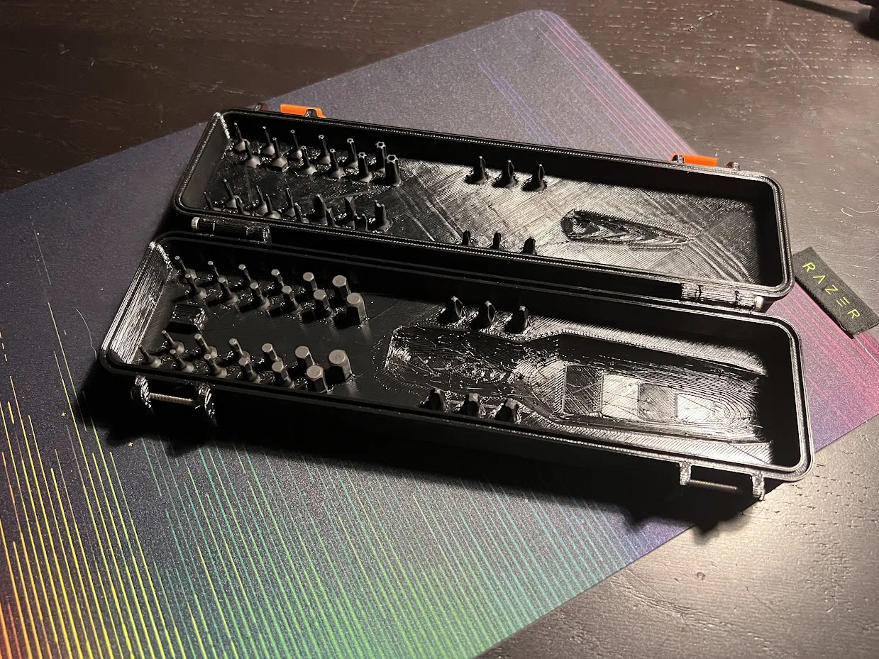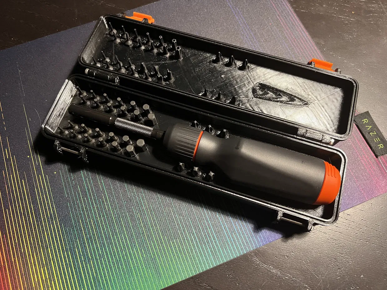 Khi cuối cùng mình nhận được thông báo LTT Screwdriver đã ship, mình đi kiếm một cái case / organizer cho đẹp mà tìm hoài không thấy cái nào đúng nhu cầu. Vậy nên mình lấy mẫu Rugged Box (Parameterizable) của WhityLTT Screwdriver Mockup của MiniMadRyan rồi làm ra một cái case để đựng tua vít và toàn bộ số bits mình đặt thêm (60 cái). Mình cố tối ưu kích thước của case nhưng vẫn chứa được hết số bits mình muốn, kèm thêm nam châm để đảm bảo về sau không bị lỏng rớt.