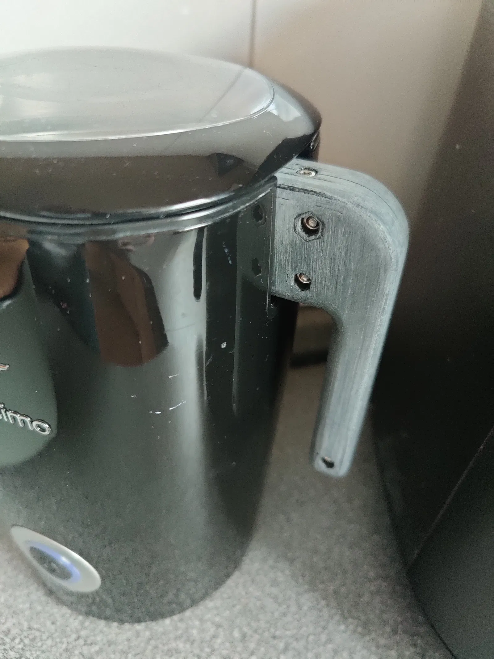 Tay cầm thay thế cho máy đánh sữa Tschibo. Thiết kế để in ABS giúp chịu được rửa bằng máy rửa chén. Lắp ráp bằng 3 vít M3 ngắn (12–15mm), 1 vít M3 dài (tới 30mm) và 4 đai ốc M3.