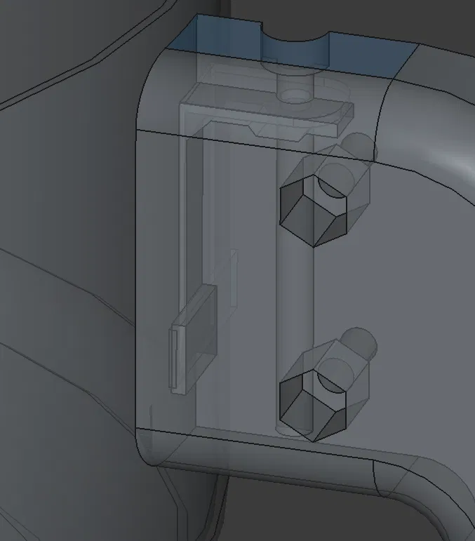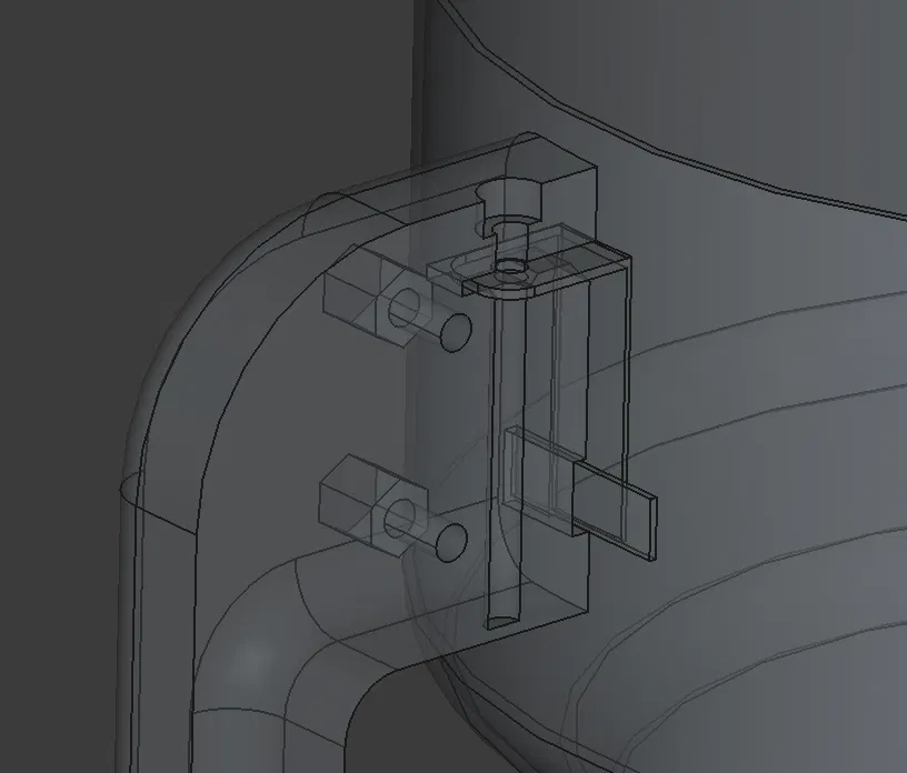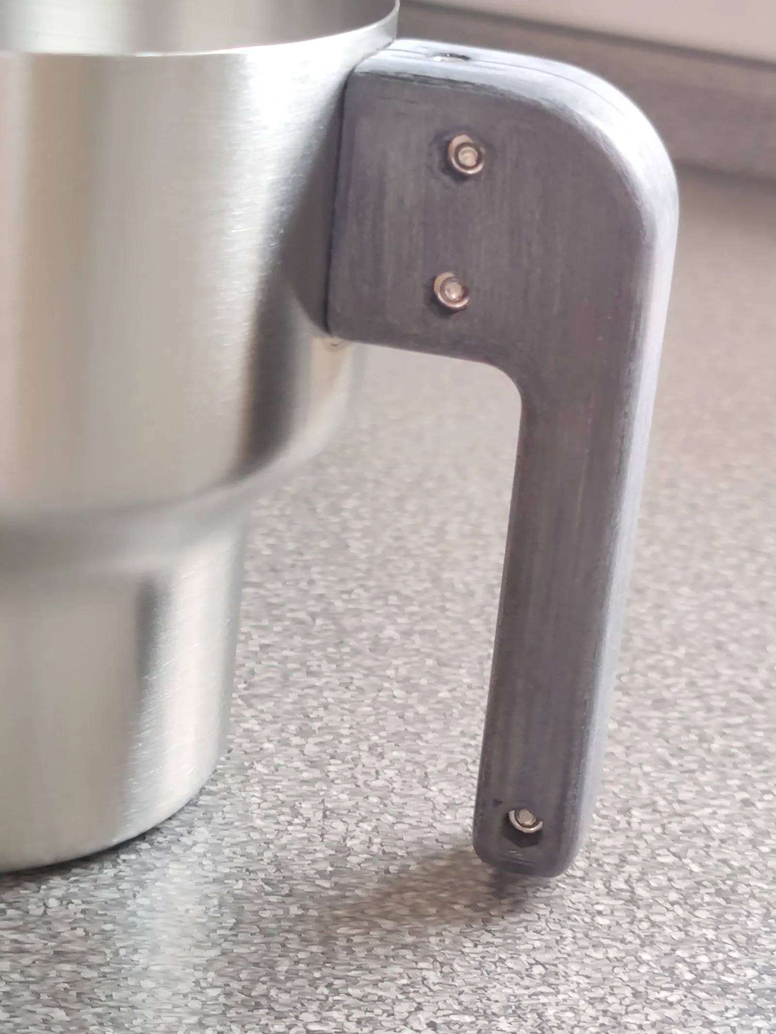Cách lắp như sau: Gắn nửa đầu tiên của tay cầm vào từ bên hông, rồi gắn nửa còn lại từ phía đối diện. (Máy đánh sữa có một cái ngàm/“mũi” nhỏ để phần in 3D gài vào.) Sau đó siết các vít M3 ngắn với đai ốc để ép hai nửa tay cầm lại và giữ cố định đúng vị trí. Cuối cùng vặn vít M3 dài vào. Lưu ý: đừng siết quá chặt, vì có thể làm tay cầm bị tách ra. Con vít này chỉ dùng để bắt tay cầm vào phần ren của máy đánh sữa.