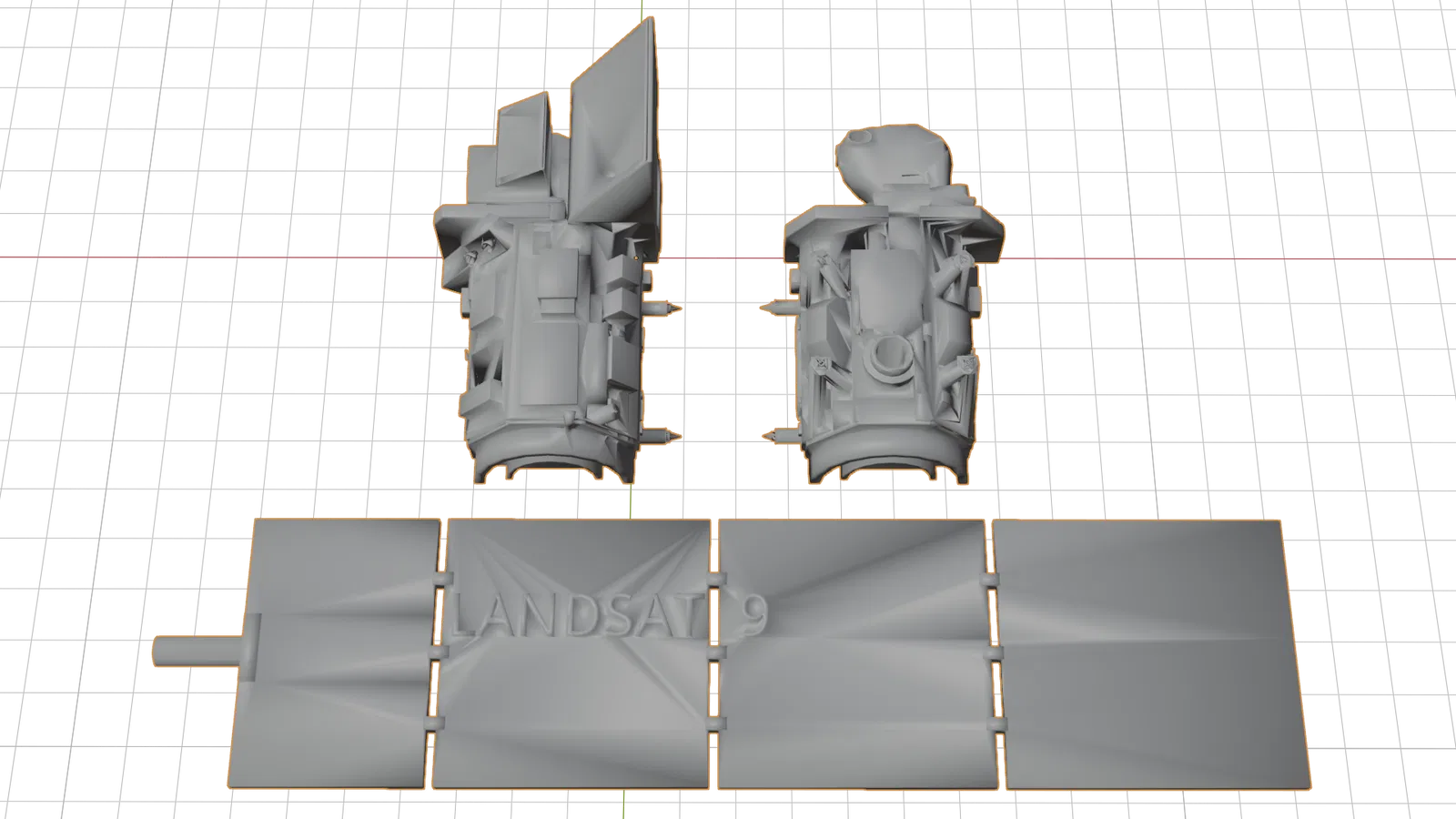 Mô hình LANDSAT 9 Satellite dùng cho quan sát Trái Đất. File STL gồm 3 phần: solar array và 2 nửa thân spacecraft. Dán hai nửa lại, gắn solar array có thể điều chỉnh; chi tiết thiết bị khoa học được thể hiện rõ.