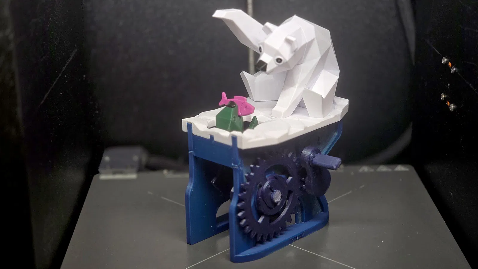 Mẫu automata động học dễ thương: gấu Bắc Cực cố chụp cá từ một chú seal trêu ngươi. Bản remix tối ưu workflow để giảm supports, dễ slicing và in ổn định hơn, gần như không cần ốc vít hay keo.
