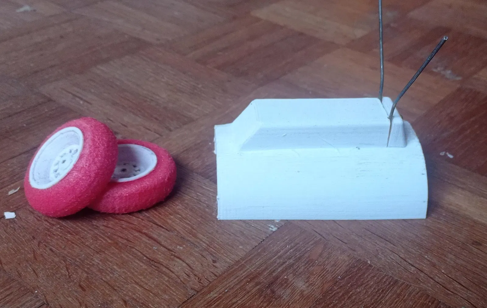 Bánh xe làm từ pool noodle, càng đáp làm bằng nan hoa xe đạp.