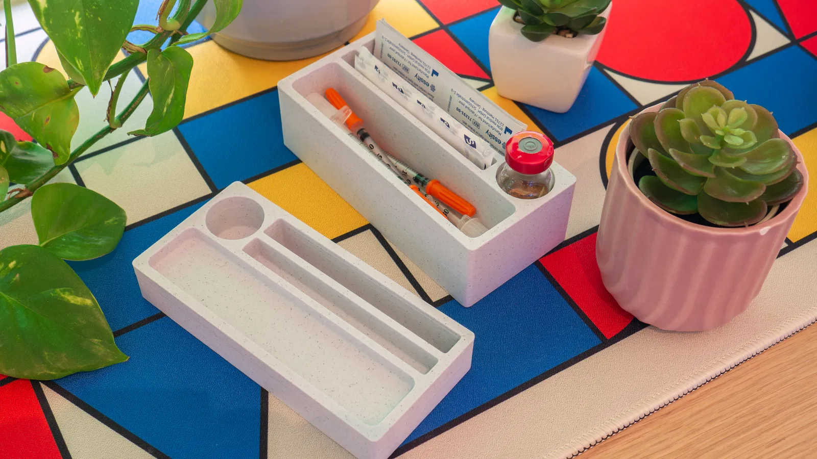 Hộp đựng vật tư tiêm HRT nhỏ gọn, đủ chỗ cho 1 vial, band-aids, alcohol wipes và kim tiêm. Nắp có nam châm ẩn giữ chắc (khuyên dùng nam châm ≤ 4 x 1.5 mm). Thiết kế tối giản, tiện mang đi.