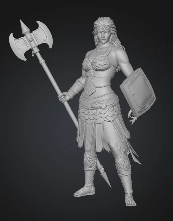 Mẫu 3D “Shield Maiden with War Axe” khắc họa một nữ chiến binh cầm khiên và rìu chiến, phong thái mạnh mẽ, hợp để trưng bày hoặc in làm mô hình nhân vật fantasy.