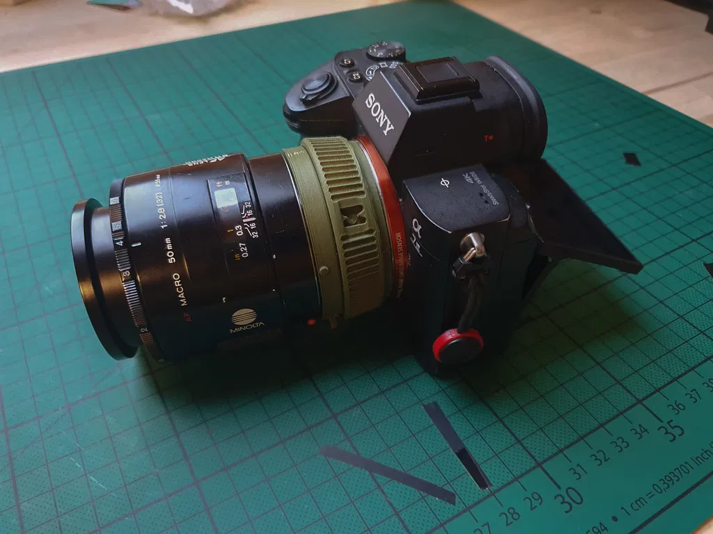 Ngàm chuyển để gắn lens Minolta/Sony A-Mount lên body Sony E-Mount, có cơ cấu điều khiển khẩu độ. File in 3D dùng PLA, hỗ trợ ốc M2x10, insert M2 và lò xo nén; có mẹo thay thế khi thiếu linh kiện.