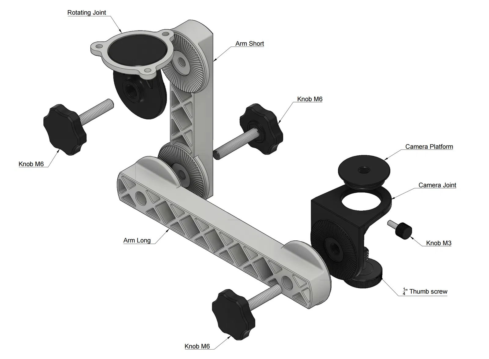 Tay đòn khớp cho camera/đèn, in hoàn toàn, chịu lực tốt (đèn 500g vẫn ổn). Có 2 chiều dài, có thể nối nhiều tay. Dùng heat set inserts M6 8x8 mm, cần ốc vặn tay 1/4" cho camera.