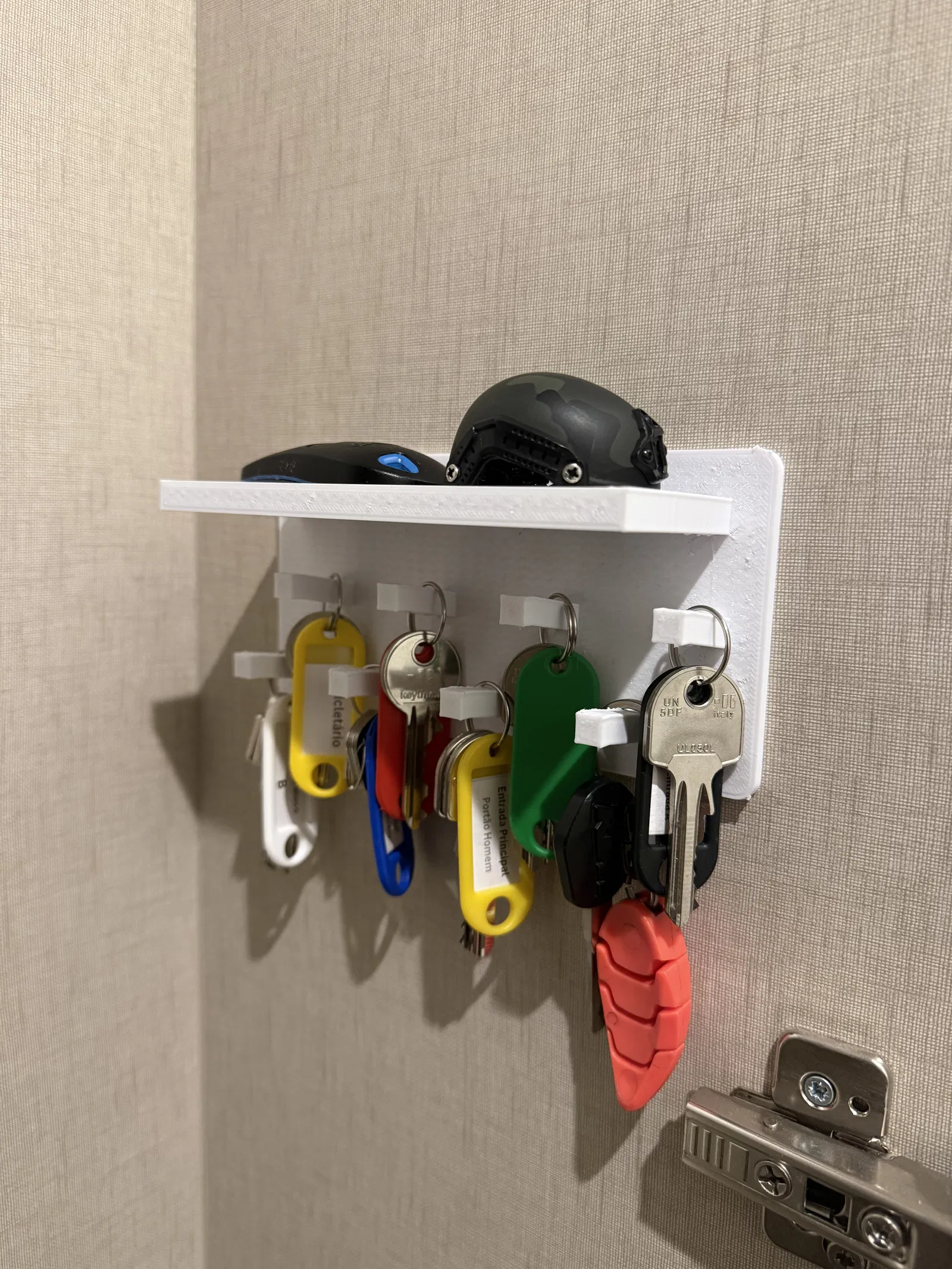 Giá treo chìa khóa gồm 8 móc kèm khay để đồ lặt vặt. Móc được thiết kế có độ nghiêng giúp chìa khóa bám chắc, in không cần supports. Có thể dán tường bằng băng keo 2 mặt hoặc tự thêm lỗ để bắt vít.