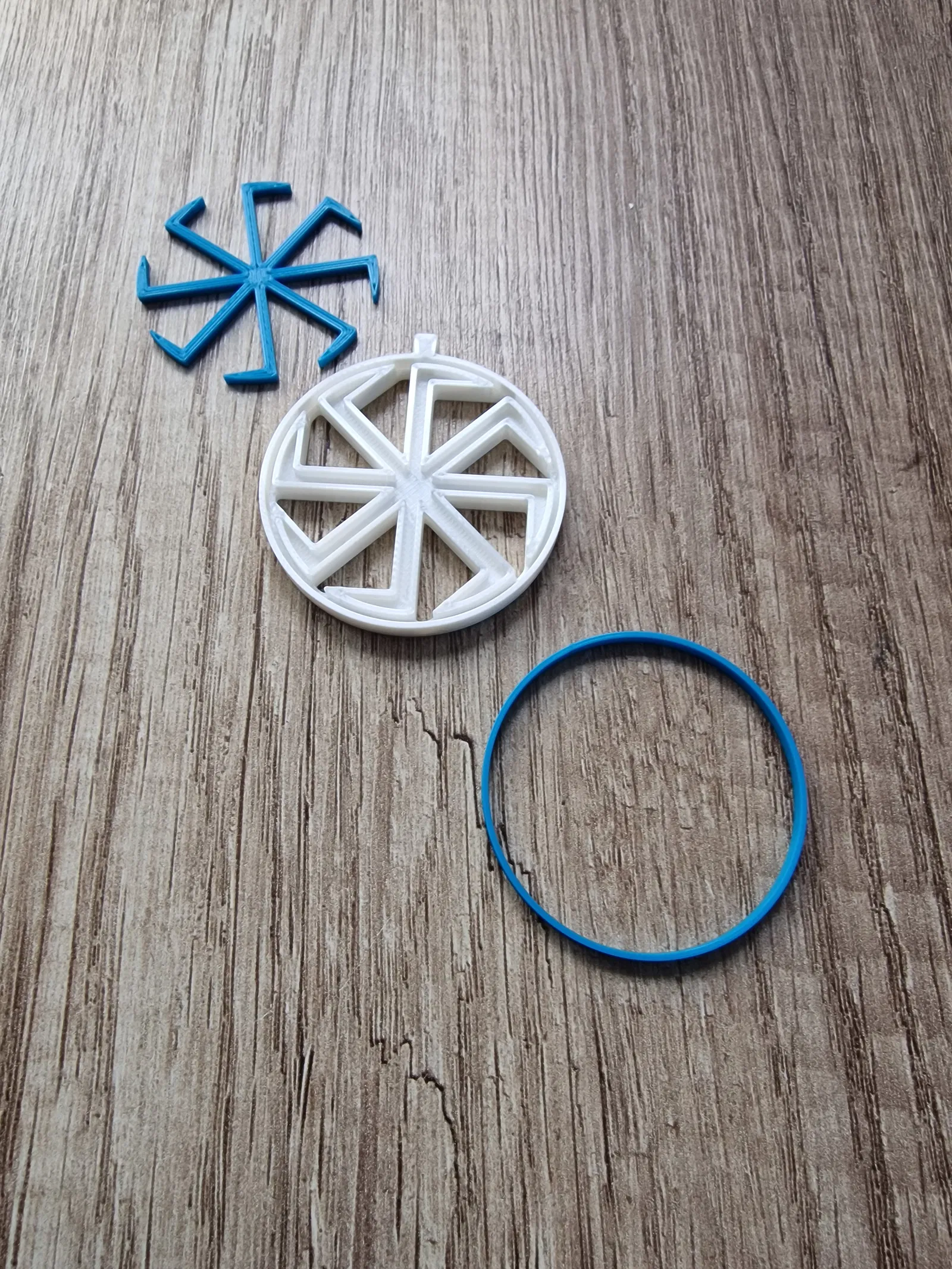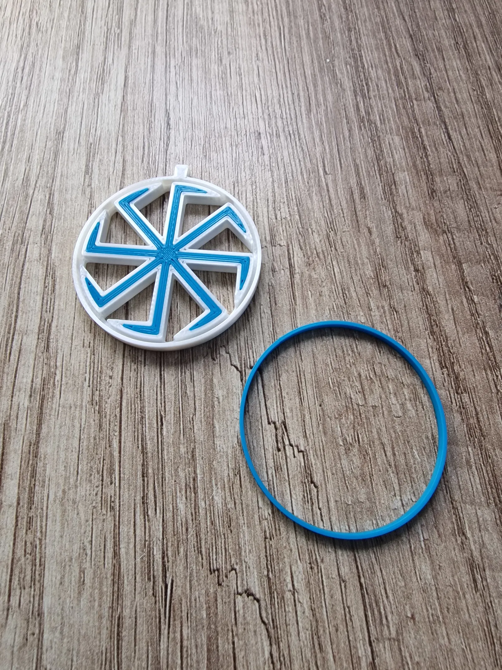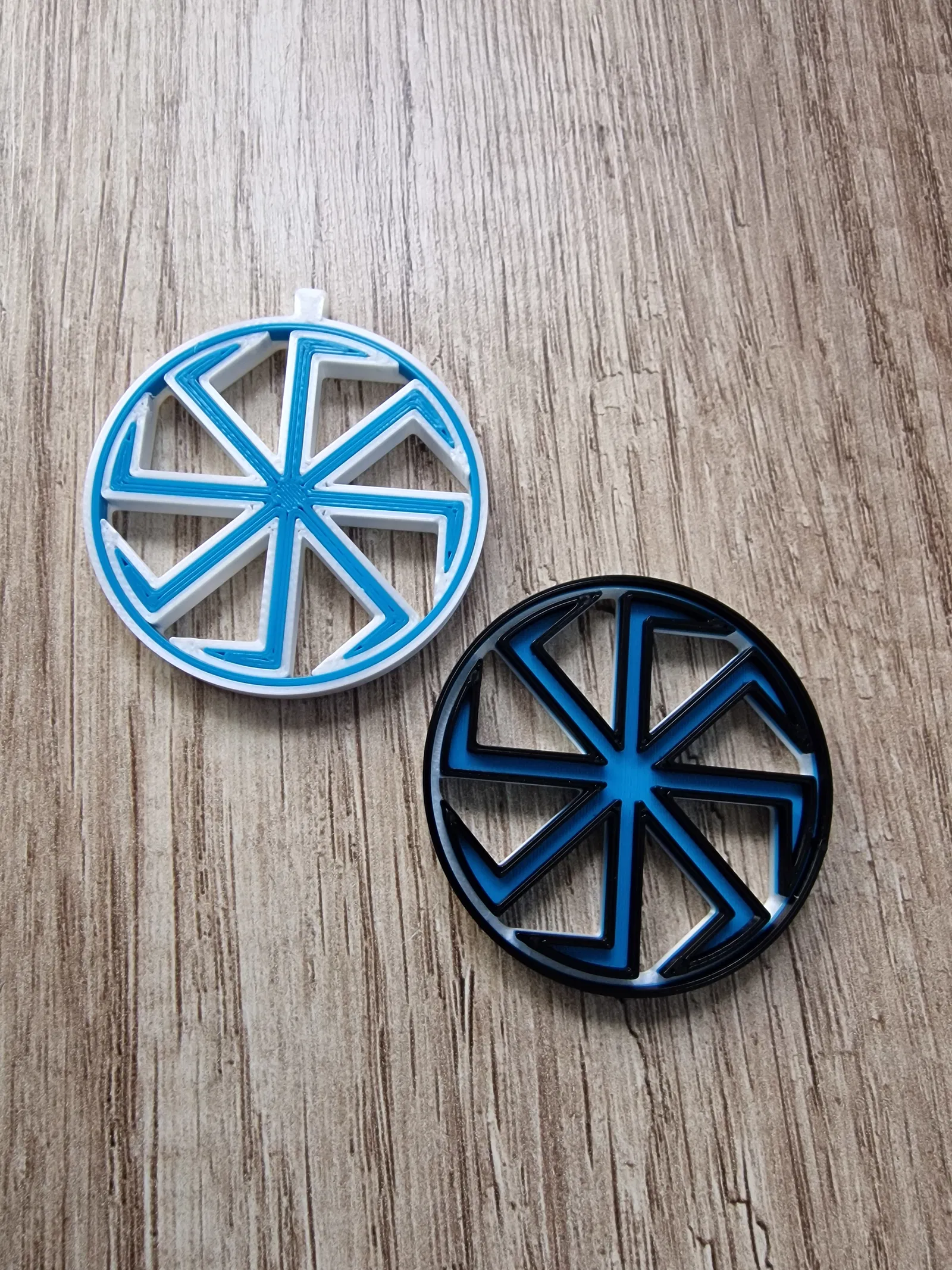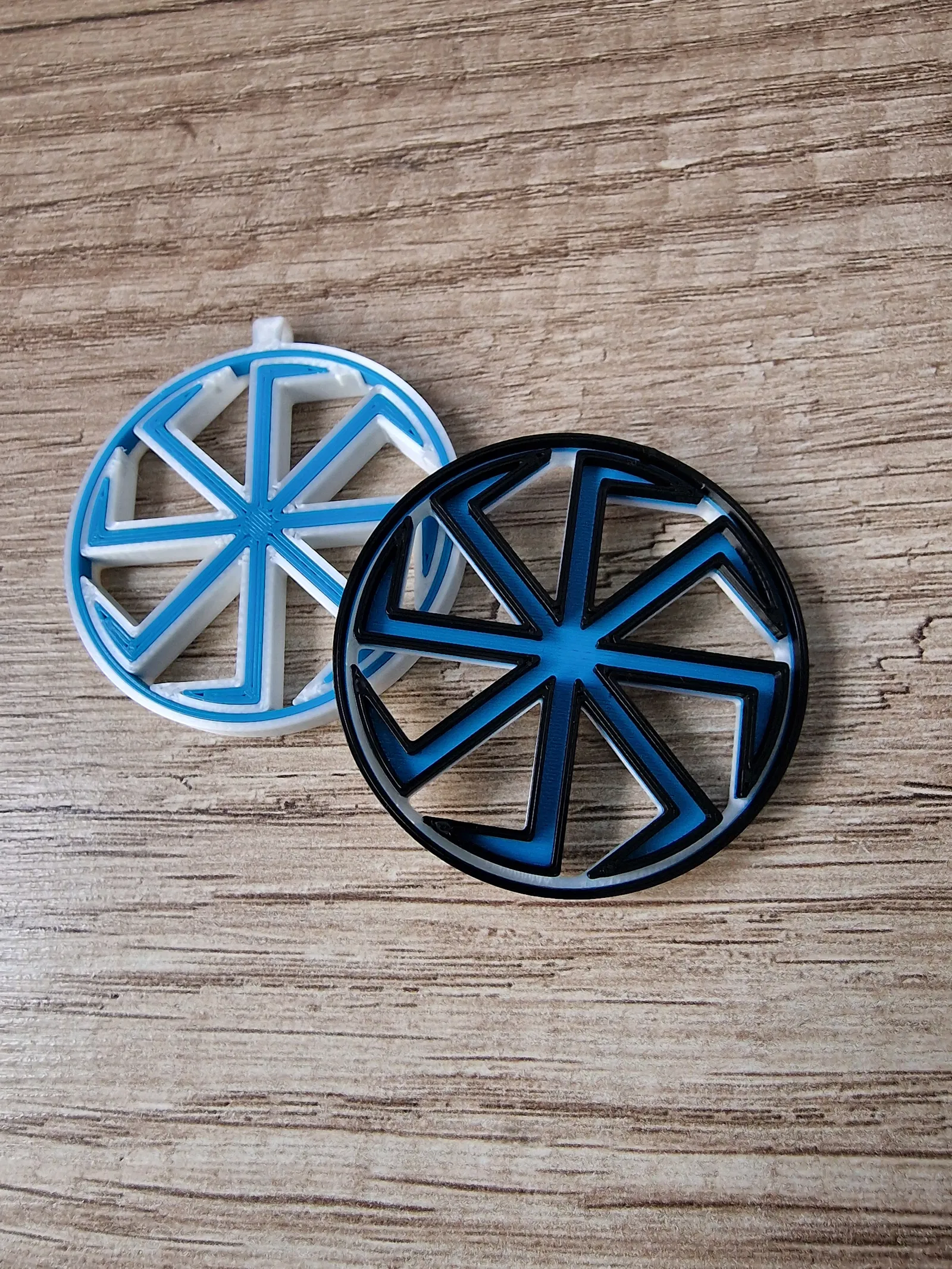 Kolovrat là biểu tượng trong thần thoại Slav, gắn với Mặt Trời và các chu kỳ của sự sống. Mẫu đường kính khoảng 50mm, gồm v1/v2 và bản multi color (asm), in nhanh, không cần supports, layer 0.2 mm.