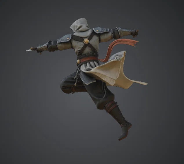Hai tay vươn ra, song đao sẵn sàng xé toạc bóng tối, tên rogue này toát lên tốc độ, độ chuẩn xác và sát ý chết người. Áo choàng bay lượn, giáp da nhiều lớp cùng đà lao người về phía trước tạo cảm giác chuyển động mạnh mẽ, giúp bản sculpt nổi bật hẳn so với các dáng đứng tĩnh.