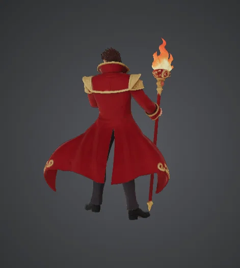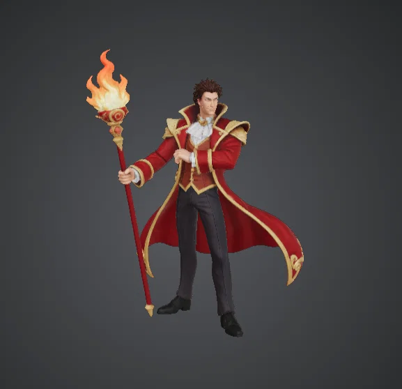 Khoác trên mình chiếc áo choàng dài màu đỏ viền vàng, vị pháp sư này đứng vững chãi, tự tin nắm chặt cây trượng với phần đỉnh bùng lên ngọn lửa ma thuật rực cháy. Các lớp trang phục xếp tầng, chi tiết hoa văn trang trí và dáng đứng điềm tĩnh tạo nên một hào quang quý tộc nổi bật — rất hợp cho những triều đình high fantasy, học viện arcane, hoặc các phe phái pháp sư tinh nhuệ.