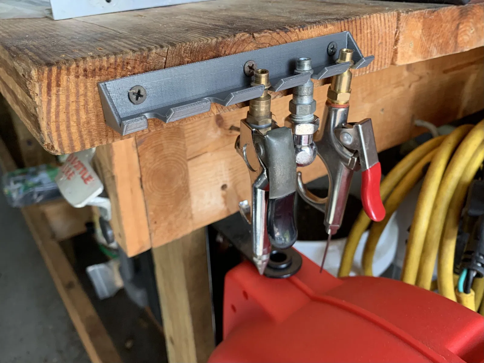 Tôi đã thiết kế cái móc này để cải thiện việc tổ chức các công cụ khí nén gần các bình khí nén trong gara của tôi. Nó dành cho các vật nhẹ như vòi khí, đầu nối, bộ chuyển đổi, v.v... Nó sẽ giữ 5 đầu nối ¼NPT kiểu công nghiệp với đủ khoảng cách để dễ dàng đặt và tháo ra. Sẽ không hoạt động với các đầu nối khí EURO ¼BSP.