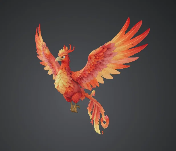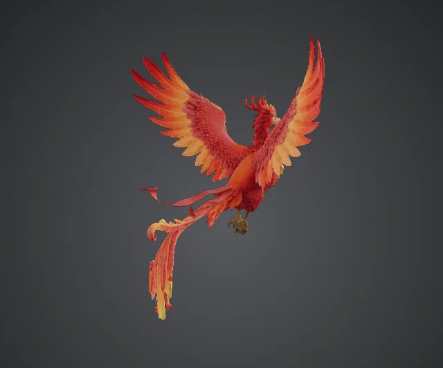 Đôi cánh rộng như ngọn lửa cùng các lớp lông xếp tầng chi tiết giúp phượng hoàng này lột tả trọn vẹn sức mạnh, sự tái sinh và nguồn năng lượng mãnh liệt của những hỏa linh huyền thoại. Phần lông đuôi uốn lượn, bập bùng như lửa sống, trong khi mào đầu kiêu hãnh và chiếc mỏ sắc hoàn thiện dáng vẻ oai vệ, vương giả.