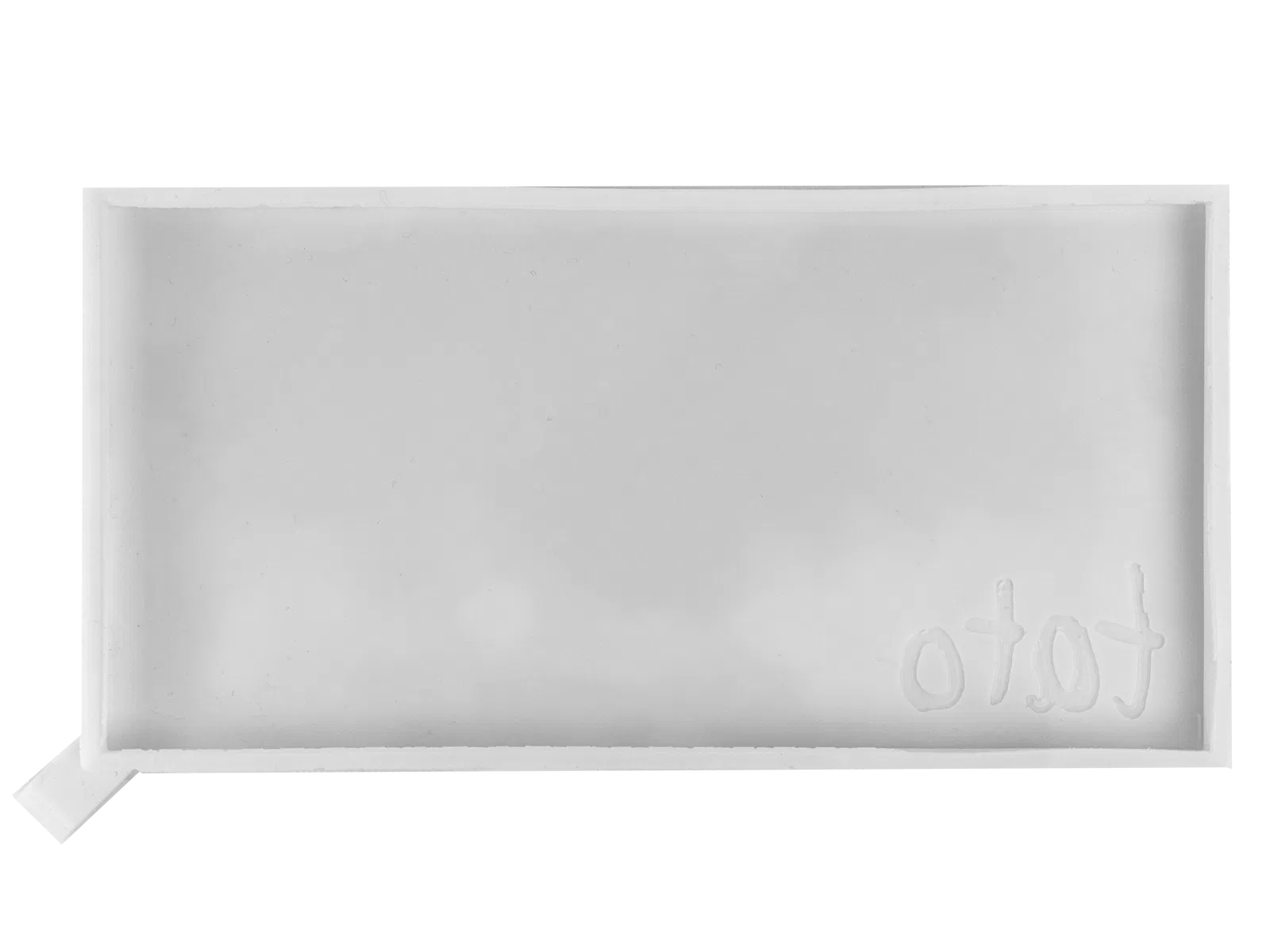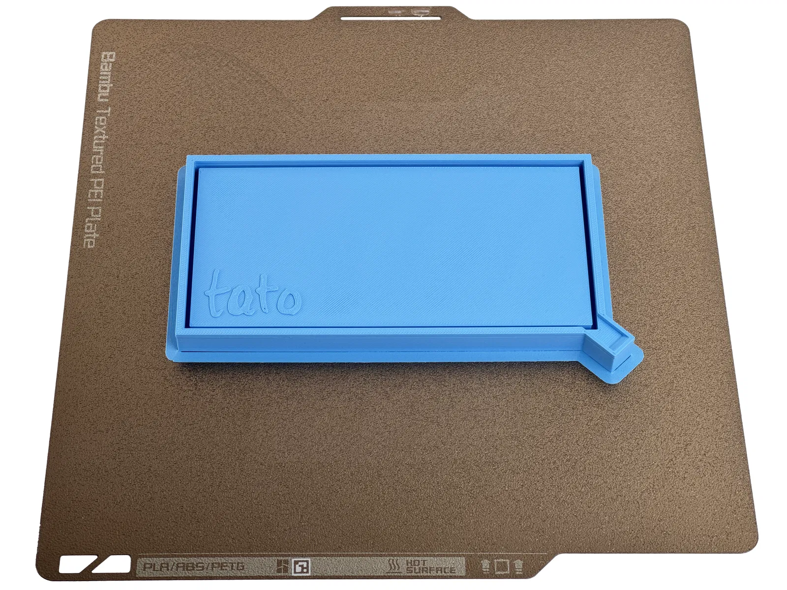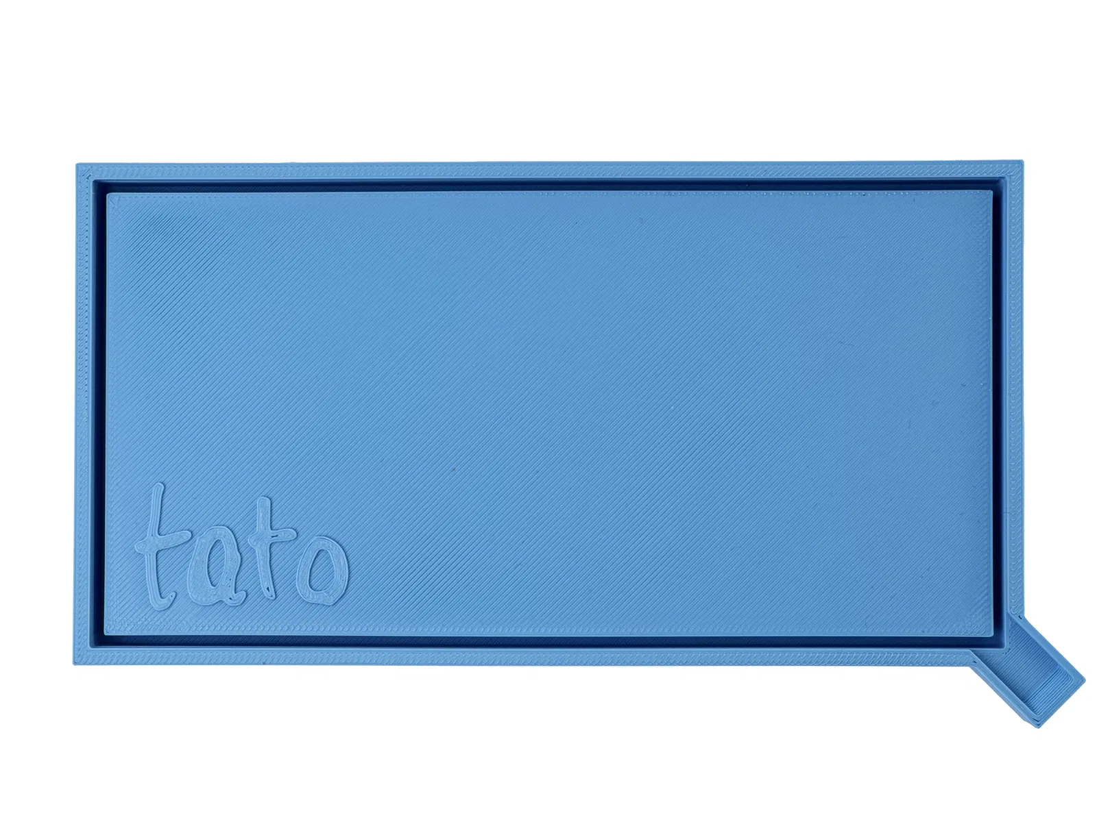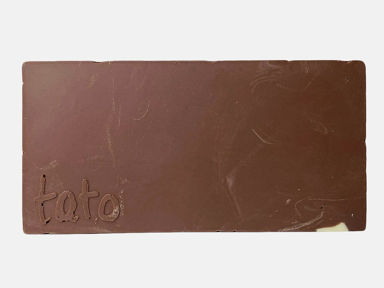 Mẫu thanh sô-cô-la sữa Tato 2 mặt nâu và trắng. Dùng 3 nguyên liệu: milk, cacao, cocoa butter. Đổ food grade silicone vào phần in 3D để làm khuôn, rồi rót ½ “Fragile” và ½ “Shiro” để tạo thanh hoàn chỉnh.