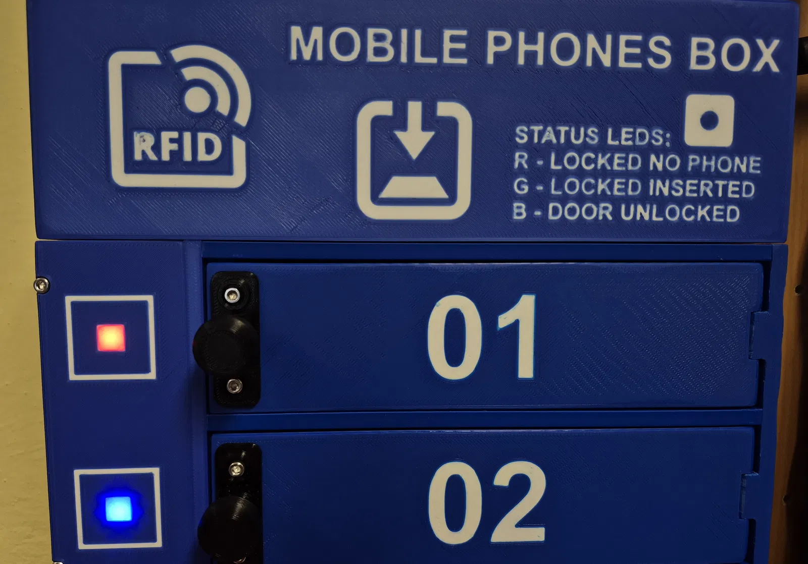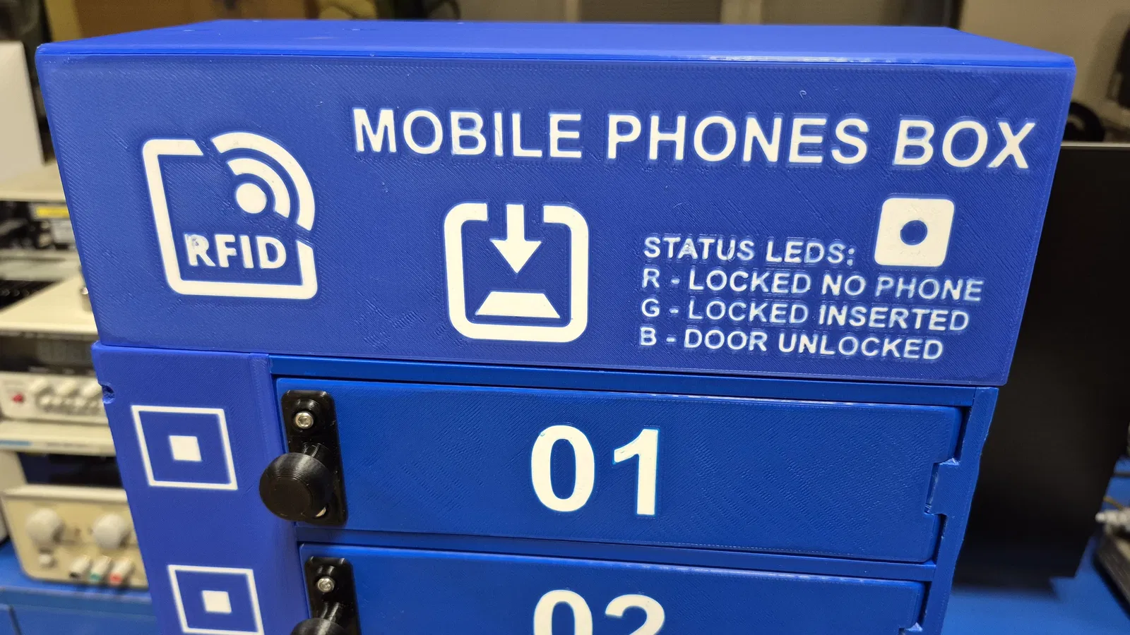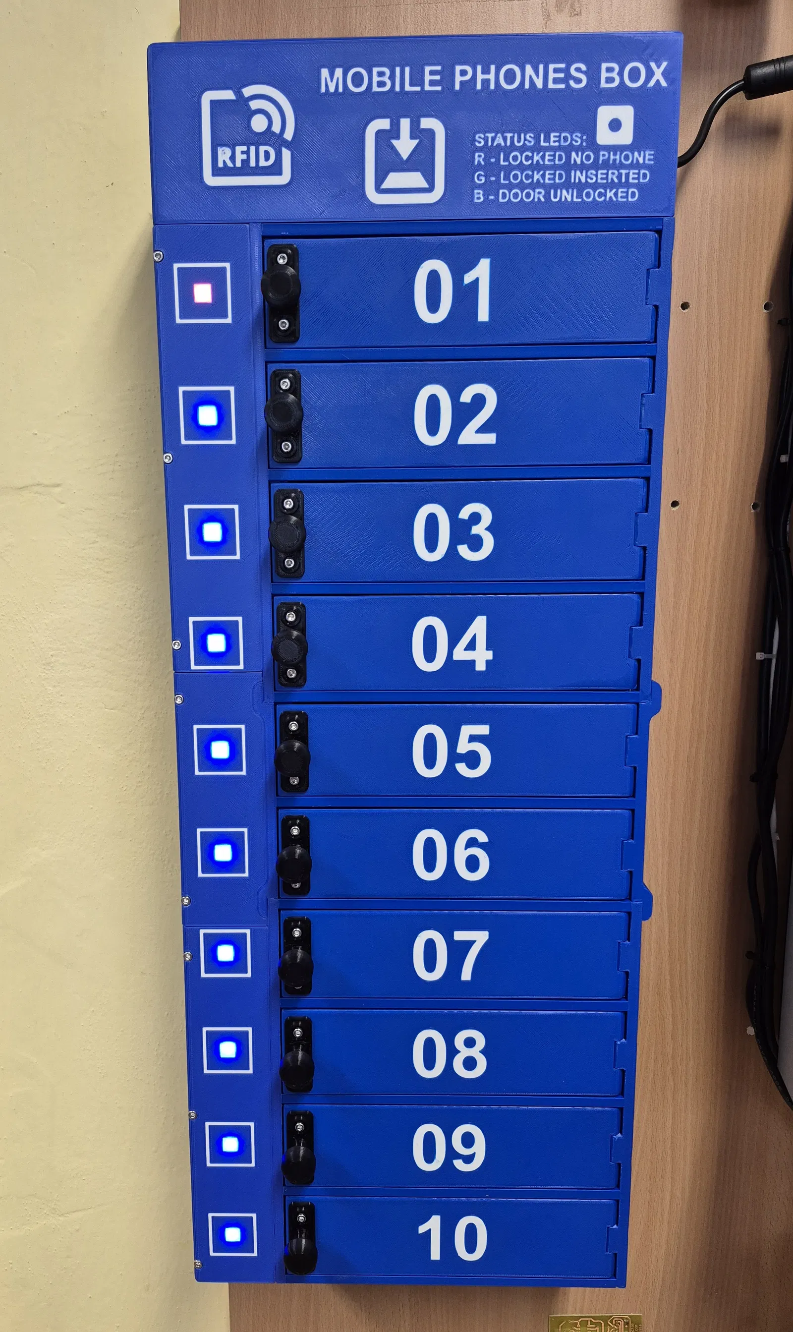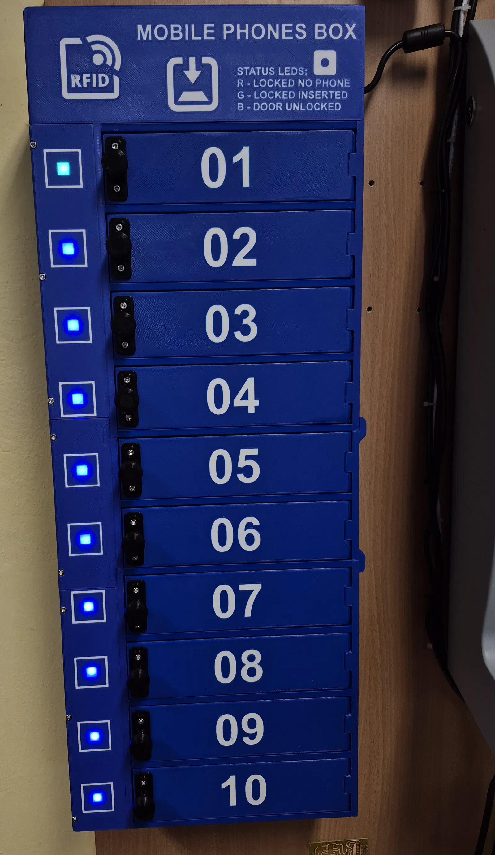 Hộp dùng để lưu trữ cùng lúc 10 điện thoại di động. File 3D printing có sẵn 2 phiên bản: có tích hợp đầu đọc RFID và bản không có RFID, phù hợp để sắp xếp điện thoại gọn gàng.