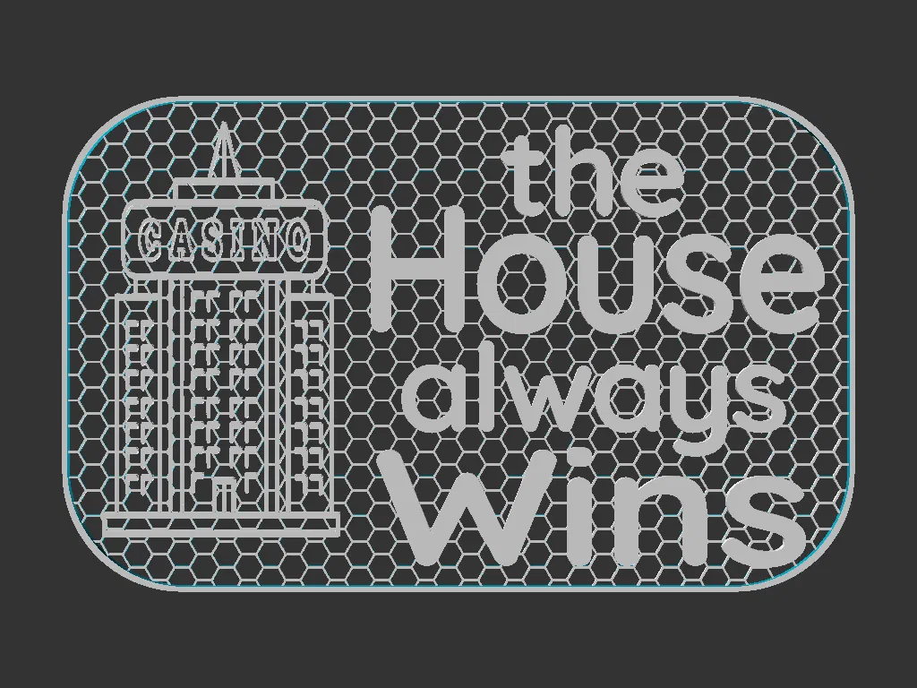 Bảng hiệu Casino 100x160mm với hình một sòng bài lớn và dòng chữ “the House always Wins”. Có file Mesh và Solid; khuyến nghị đổi màu trên 1mm (có gcode mẫu). Phù hợp dùng với Shadowbox Frames.