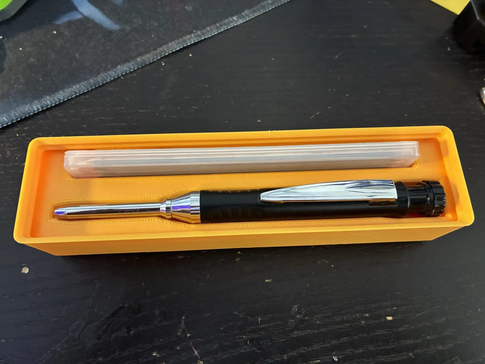 Module Gridfinity gọn gàng này được thiết kế để giữ chắc một bút chì kim, đồng thời có một ngăn riêng để cất ruột chì (lead refills).