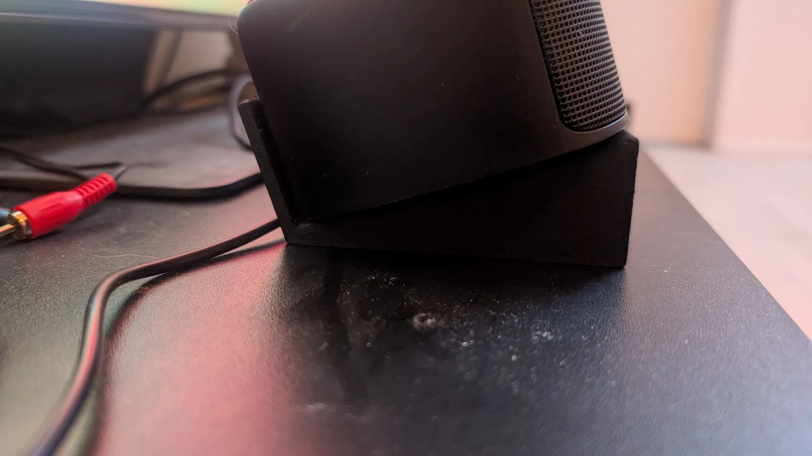 Soundbar được kê trên 2 cái “kicker” để hướng âm thanh thẳng về tai người nghe. Mình đặt chúng ngay dưới các chân cao su của soundbar để đảm bảo cách ly (isolation) và loại bỏ rung/lạch cạch.