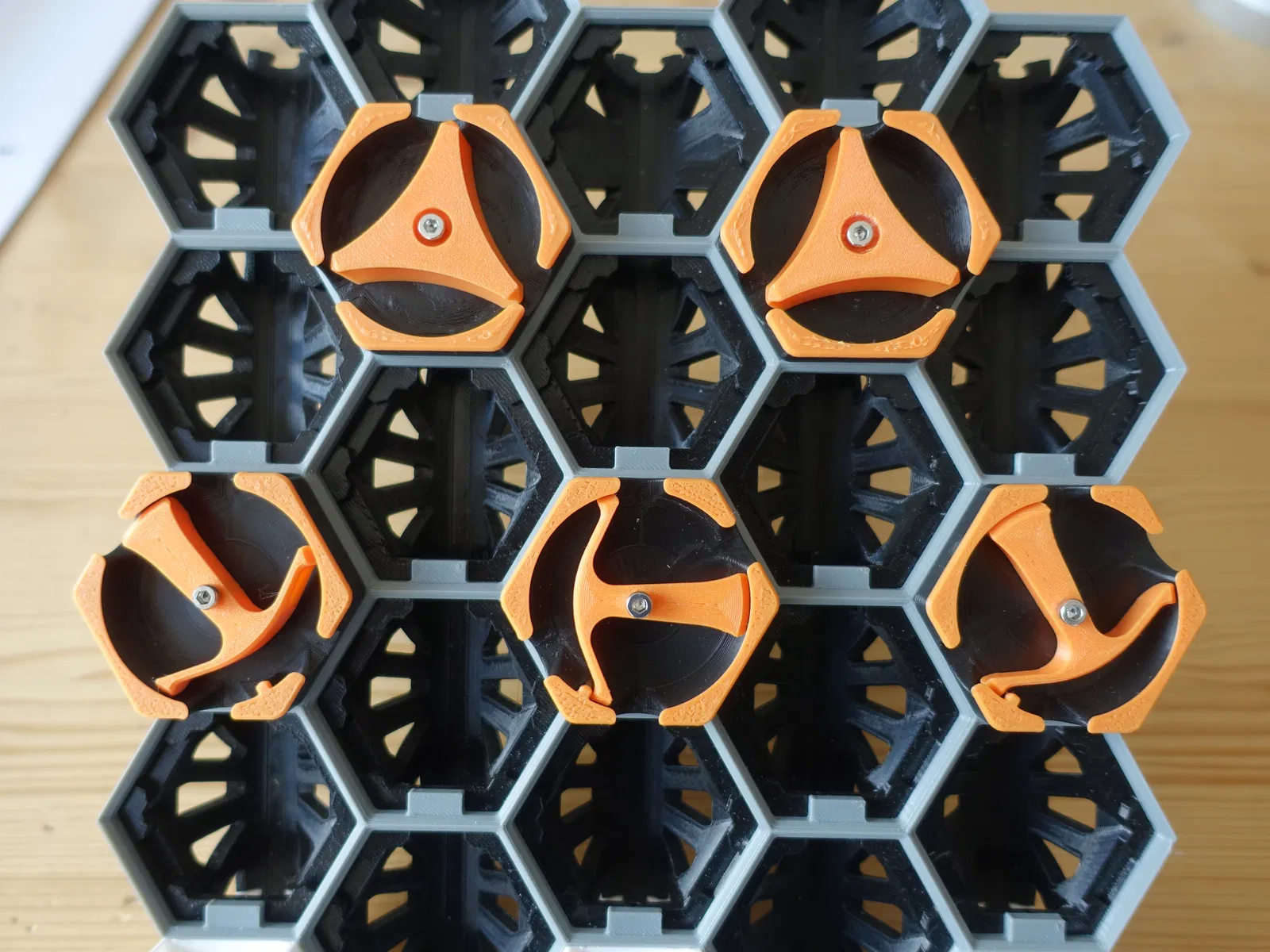 Biến thể Hextraction Flip-Flop Tile có thể xoay lệch 1 bước nên đặt được cả ở mép bàn và mọi vị trí khác. In PLA với nozzle 0.4mm, layer 0.2mm, không cần supports; lắp bằng ốc M3x16 (khuyến nghị washer M3).