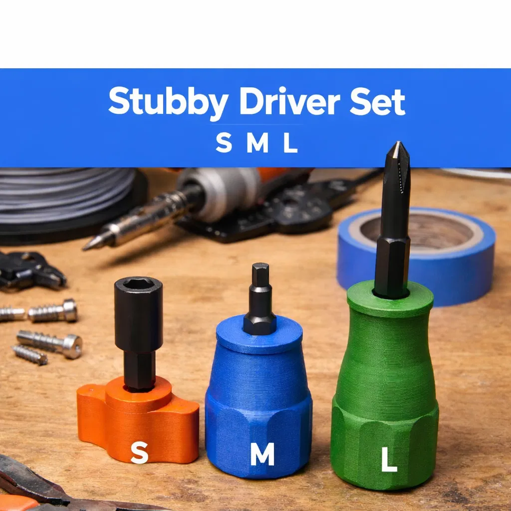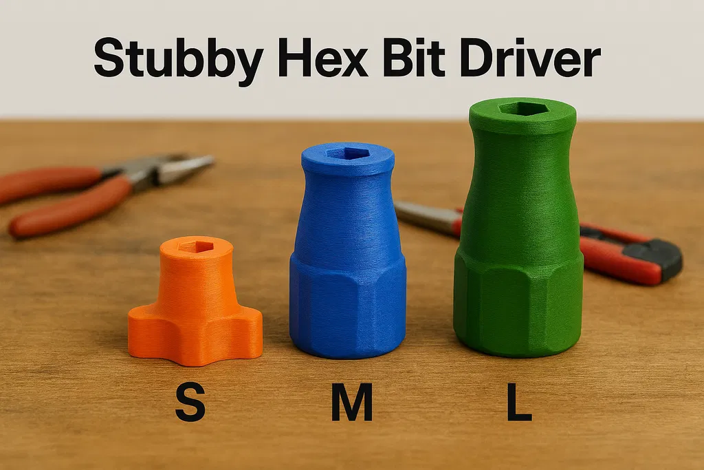 Bộ 3 Stubby Hex Bit Driver in 3D với đầu socket 1/4'' chuẩn, tương thích đa số hex bit. Gồm size S/M/L cho việc tỉ mỉ, đa dụng và cần lực siết cao. Tối ưu in FDM, không cần supports, in nhanh, ít vật liệu.