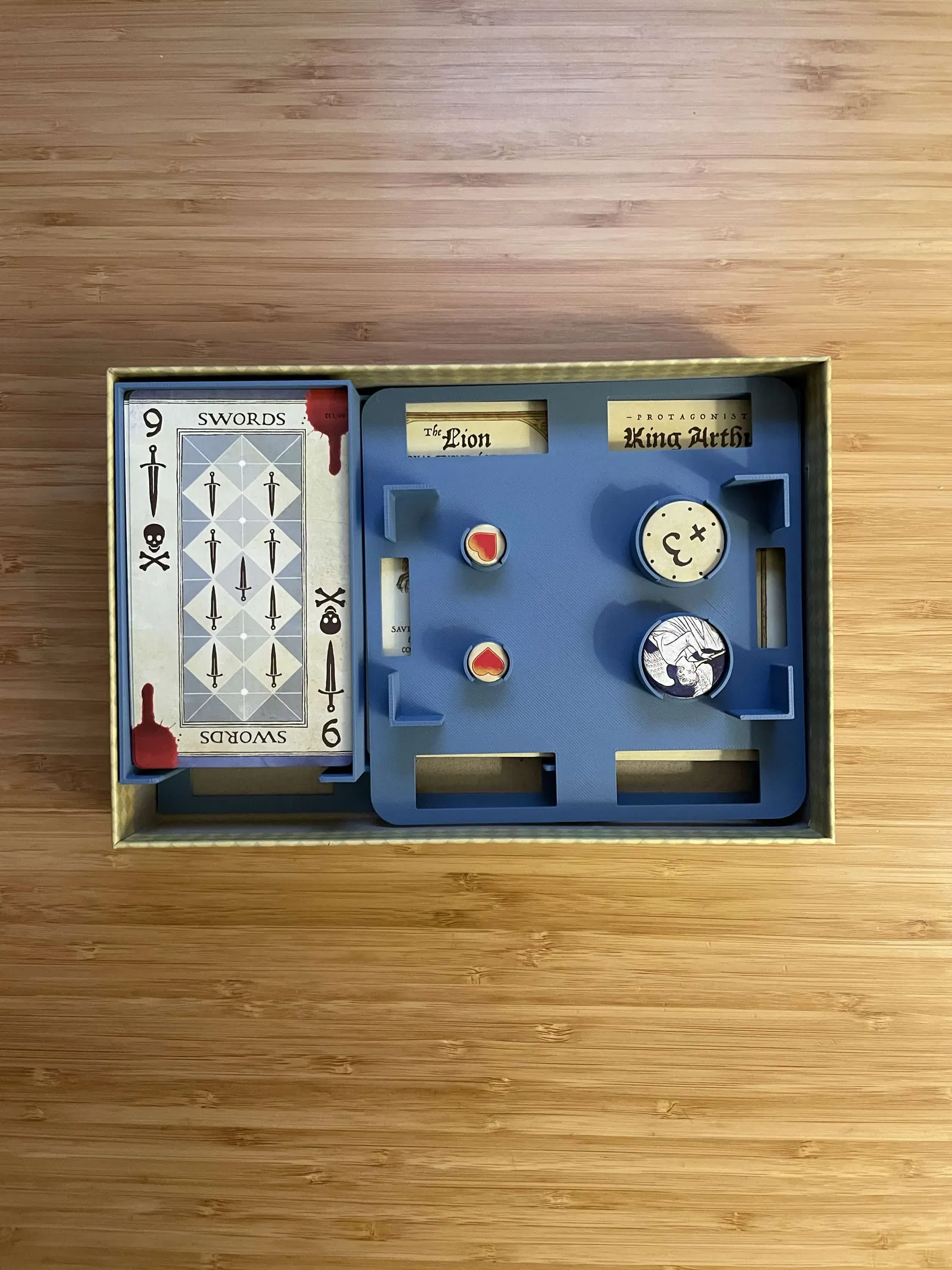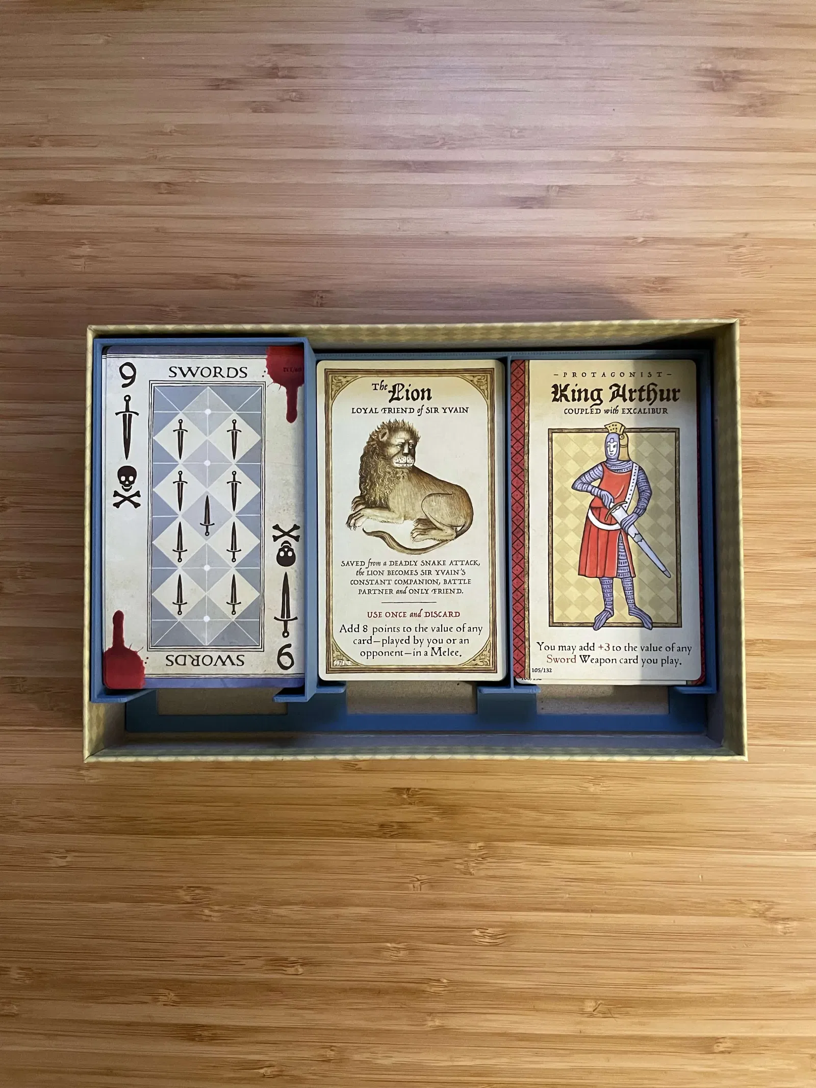 Bộ inlay cho hộp game Tournament at Camelot, gồm khay đựng thẻ (melee, godsend, character) và khay đựng token kèm thẻ health, giúp sắp xếp gọn gàng và lấy ra nhanh khi chơi.