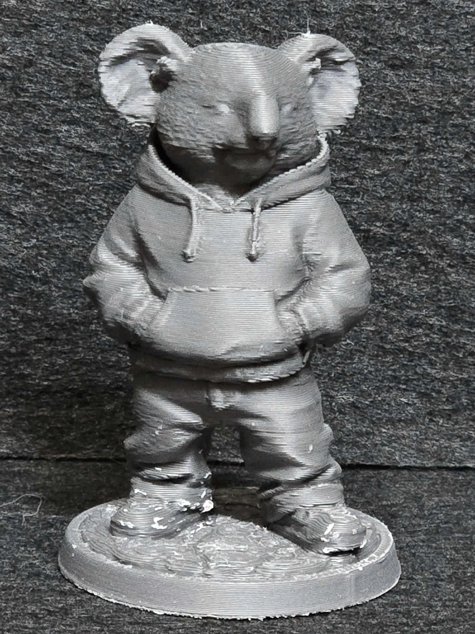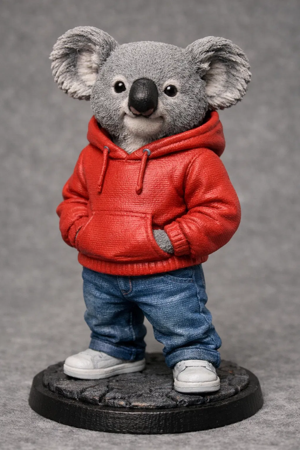 Đây là một mô hình tượng nhỏ in 3D, mô tả một chú koala nhân hoá mặc streetwear hiện đại. 🐨👕