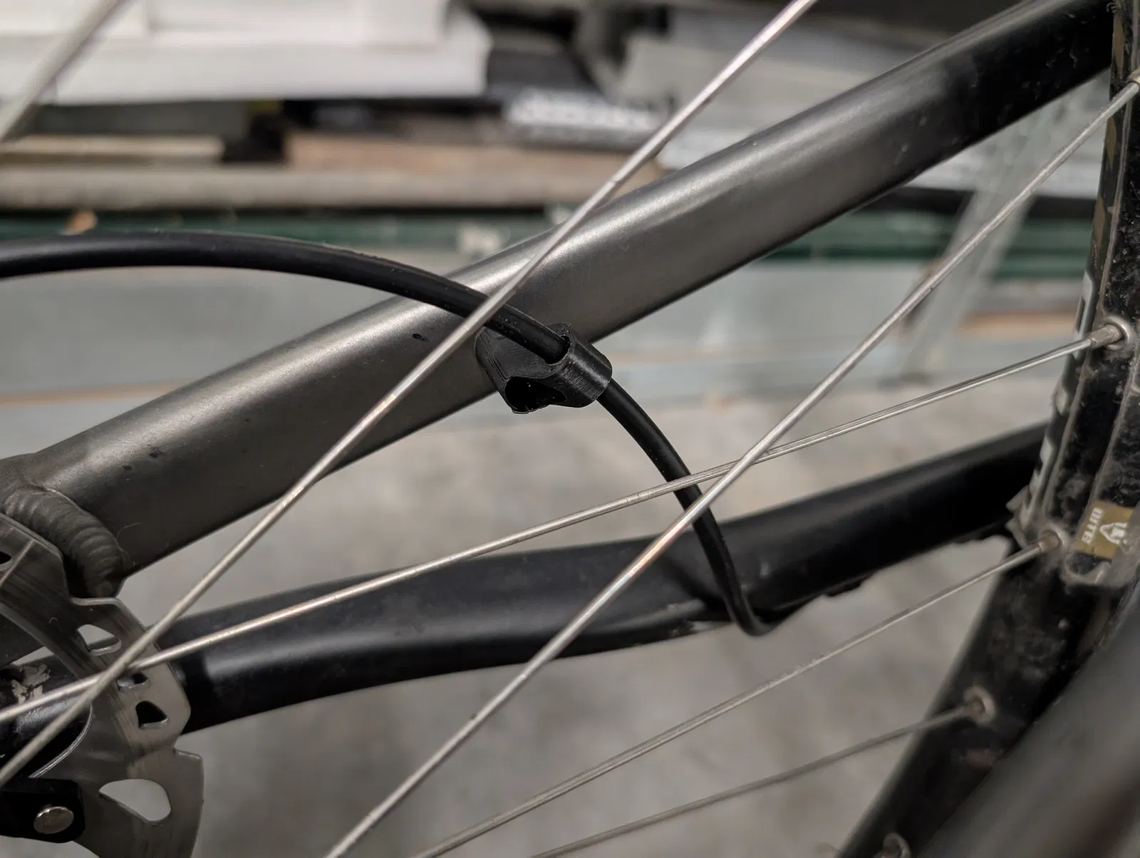 Cái guide in 3D này bắt vào đúng lỗ ren M5 nguyên bản trên seatstay. Nó kẹp dây dầu thủy lực chắc chắn và tạo độ offset cần thiết để đảm bảo dây không cạ vào nan hoa khi phuộc nhún nén hết hành trình.